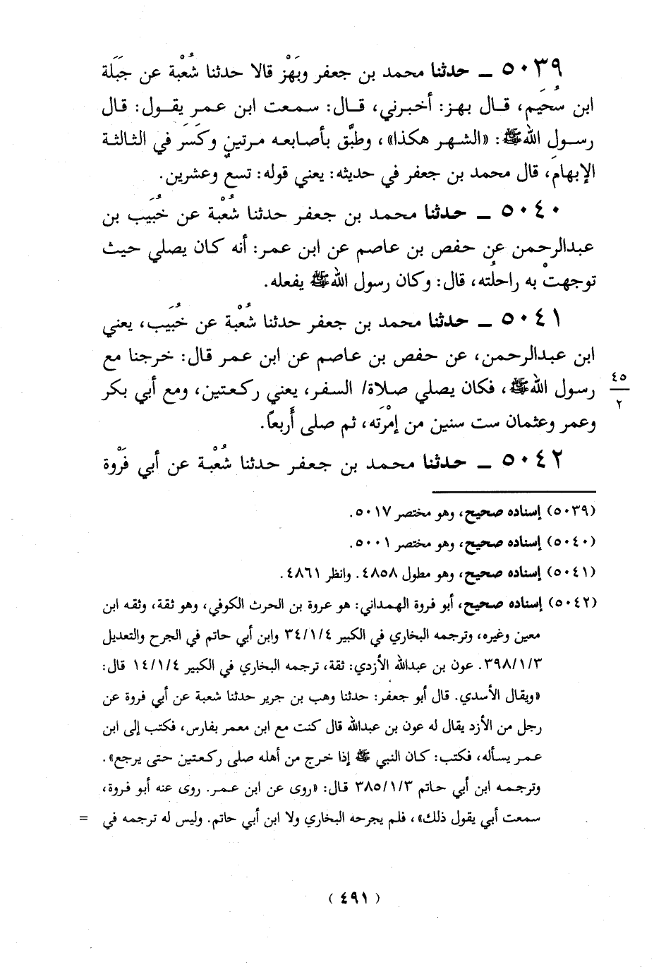 5041 - حدثنا محمد بن جعفرحدثنا شُعْبة عن خبَيب، يعني ابن عبد الرحمن، عن حفص بن عاصم عن ابن عمر قال: خرجنا مع رسول الله -صلي الله عليه وسلم -، فكان يصلي صلاة السفر، يعني ركعتين، ومع أبي بكر وعمر وعثمان عن سنين من إمْرَته، ثم صلى أًربعاً.