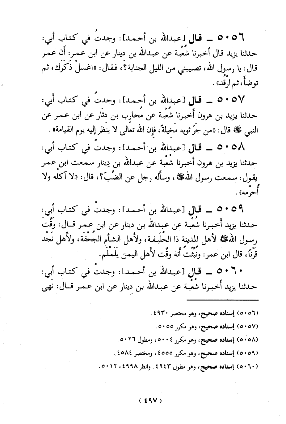 5056 - قال (عبد الله بن أحمد): وجدتُ في كتاب أبي: حدثنا يزيد قال أخبرنا شُعْبة عن عبد الله بن دينار عن ابن عمر: أن عمر قال: يا رسول الله، تصيبني من الليل الجنابة؟، فقال: "اغسلْ ذَكَرَك، ثم