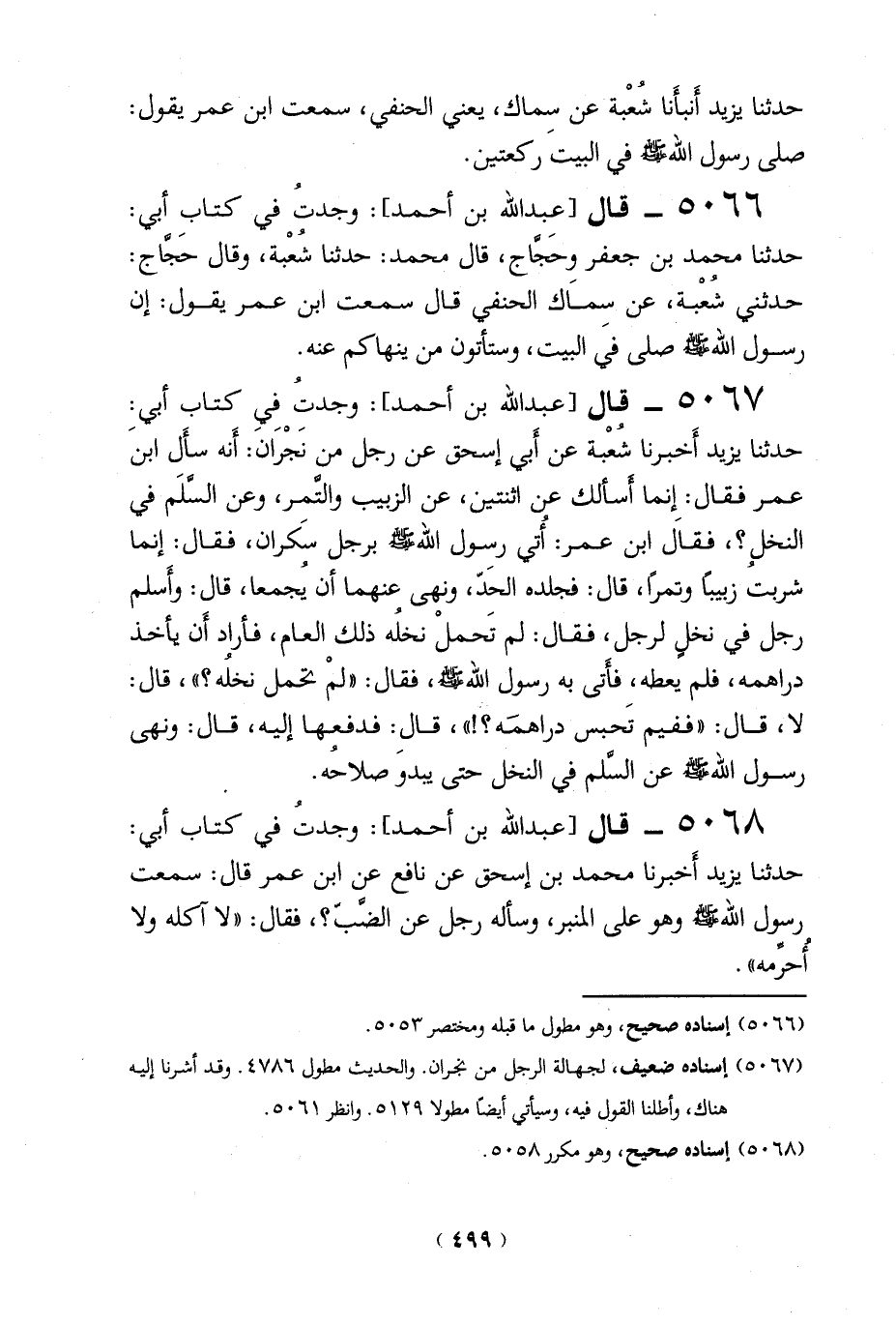 5067 - قال (عبد الله بن أحمد): وجدت فيِ كتاب أبي: حدثنا يزيد أَخبرنا شُعْبة عن أَبي إسحق عن رجل من نَجْرَان: أَنه سأَل ابنَ عمر فقال: إنما أسألك عين اثنتين، عن الزبيب والتَّمر، وعن السَّلَم في
