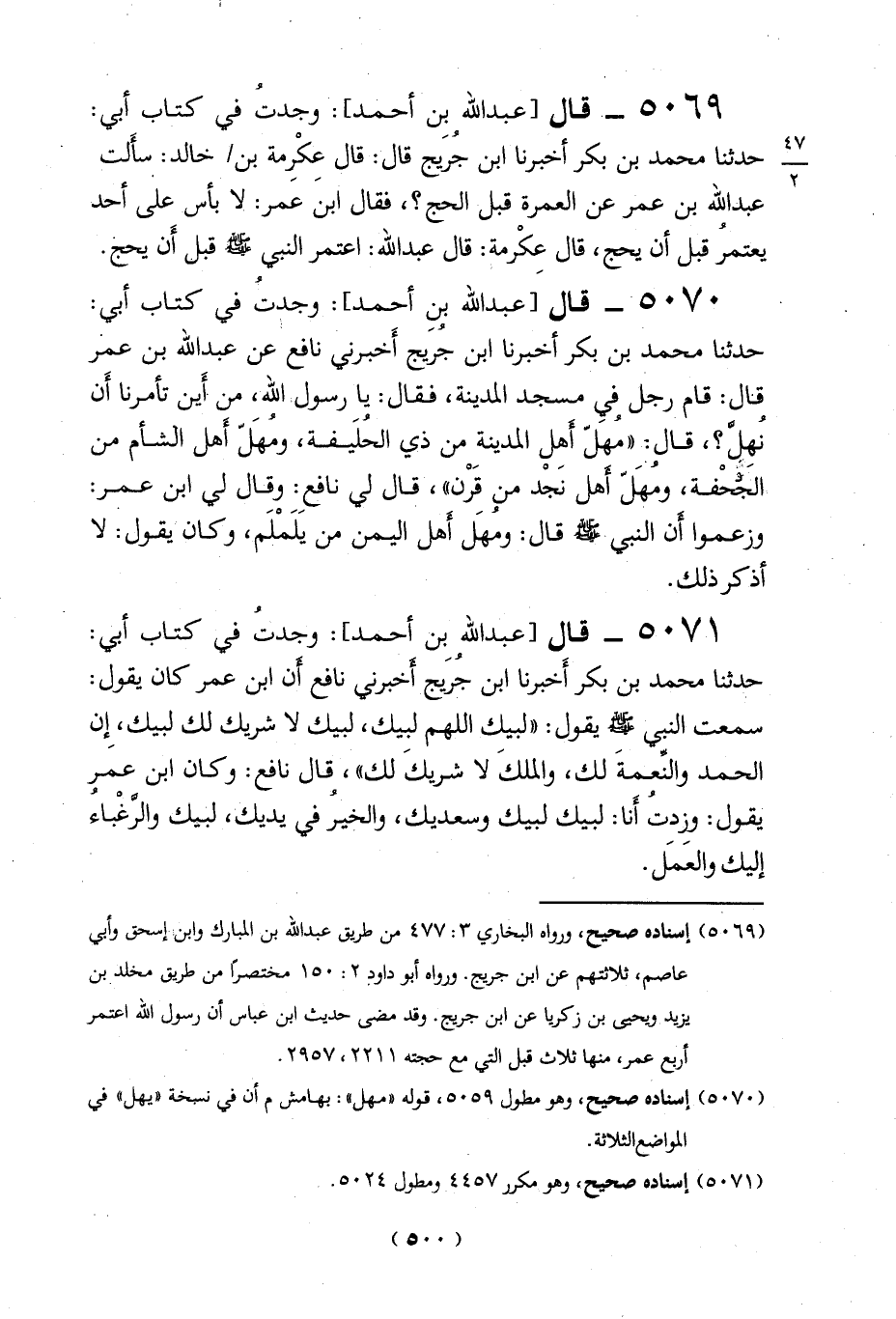 ْ5069 - قال (عبد الله بِن أحمد): وجدت في كتاب أبي: حدثنا محمد بن بكر أخبرنا ابن جُريج قال: قال عكْرِمة بن خالد: سأَلت عبد الله بن عمر عن العمرة قبل الحج؟، فقال ابنَ عمر: لا بأس على أحد