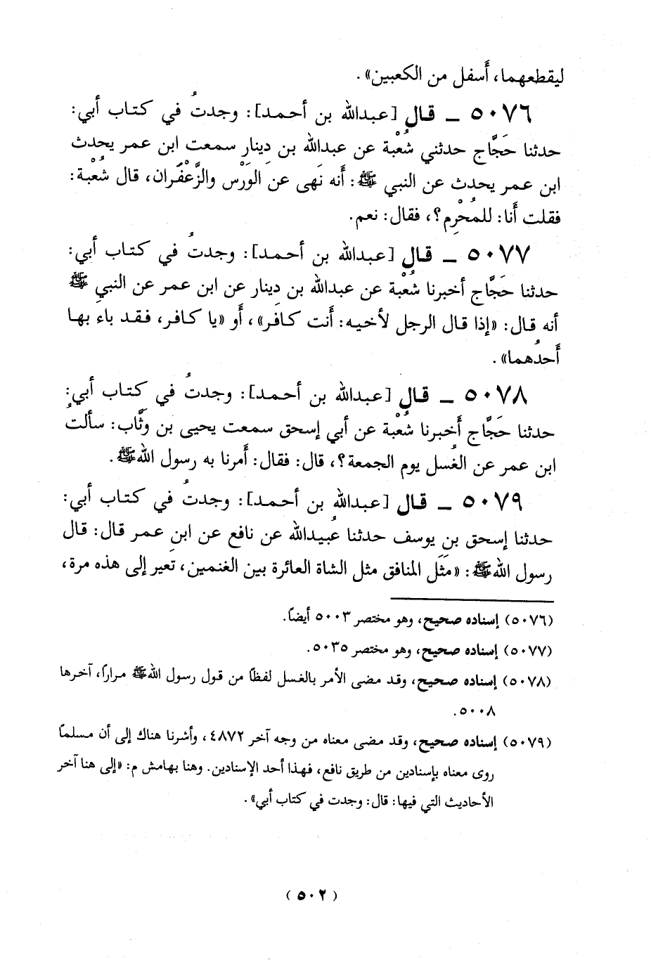 5078 - قال (عبد الله بن أحمد): وجدت في كتاب أبي حدثنا حَجَّاج أخبرنا شُعْبة عن أبي إسحاق سمعت يحيى بن وَثَّاب: سألت ابن عمر عن الغسل يوم الجمعة؟، قال: فقال: أَمرنا به رسول الله -صلي الله عليه وسلم -.