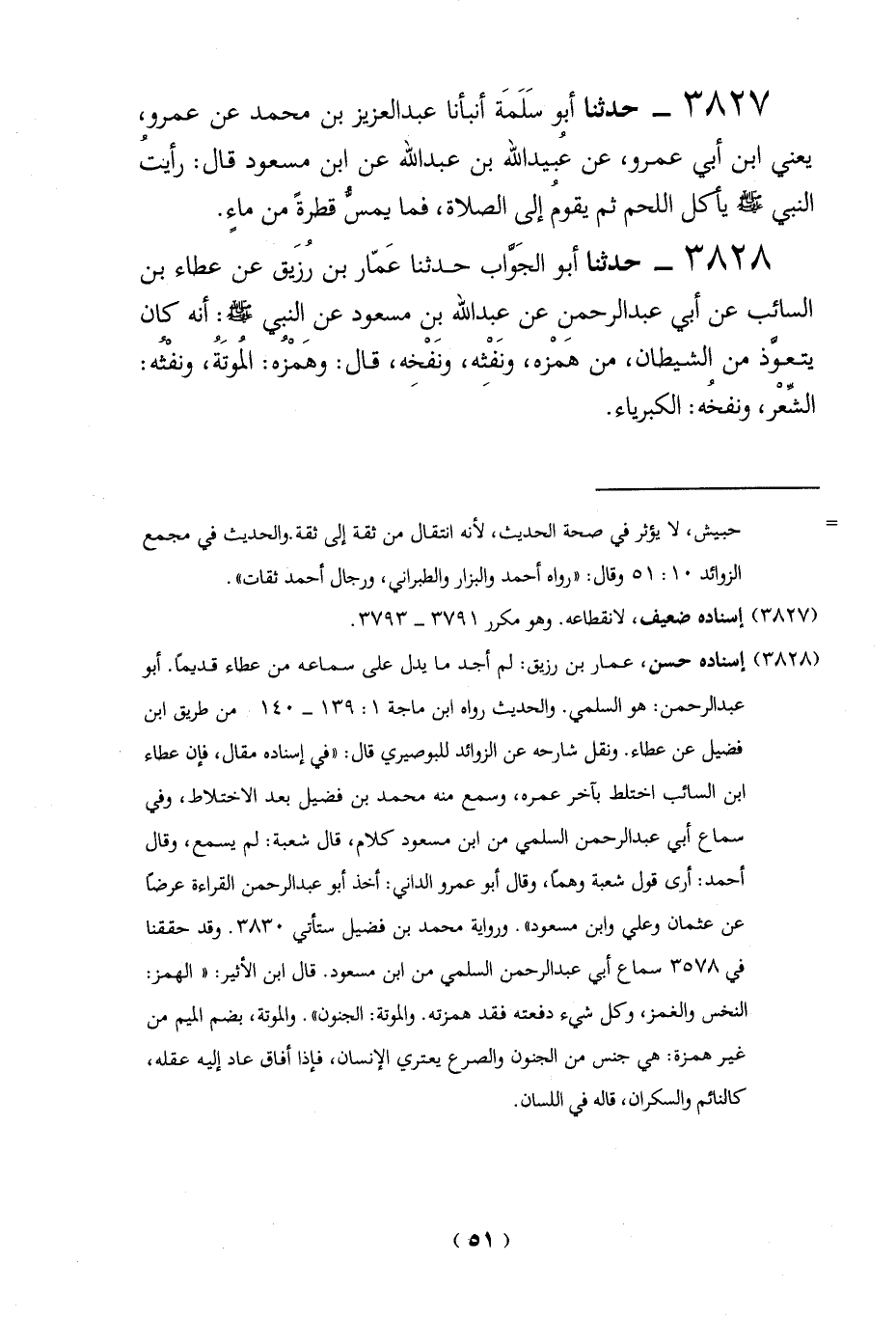 3828 - حدثنا أبو الجَوَّاب حدثنا عَمّار بن رُزَيق عن عطاء بن السائب عن أبي عبد الرحمنِ عن عبد الله بِن مسعود عن النبي - صلى الله عليه وسلم - أنه كان يتعوَّذ من الشيطان، من هَمْزه، ونَفْثِه، ونَفْخِه، قال: وهَمْزُه: المُوتَةُ، ونفْثُه: الشِّعْر، ونفخُه: الكبرياء.