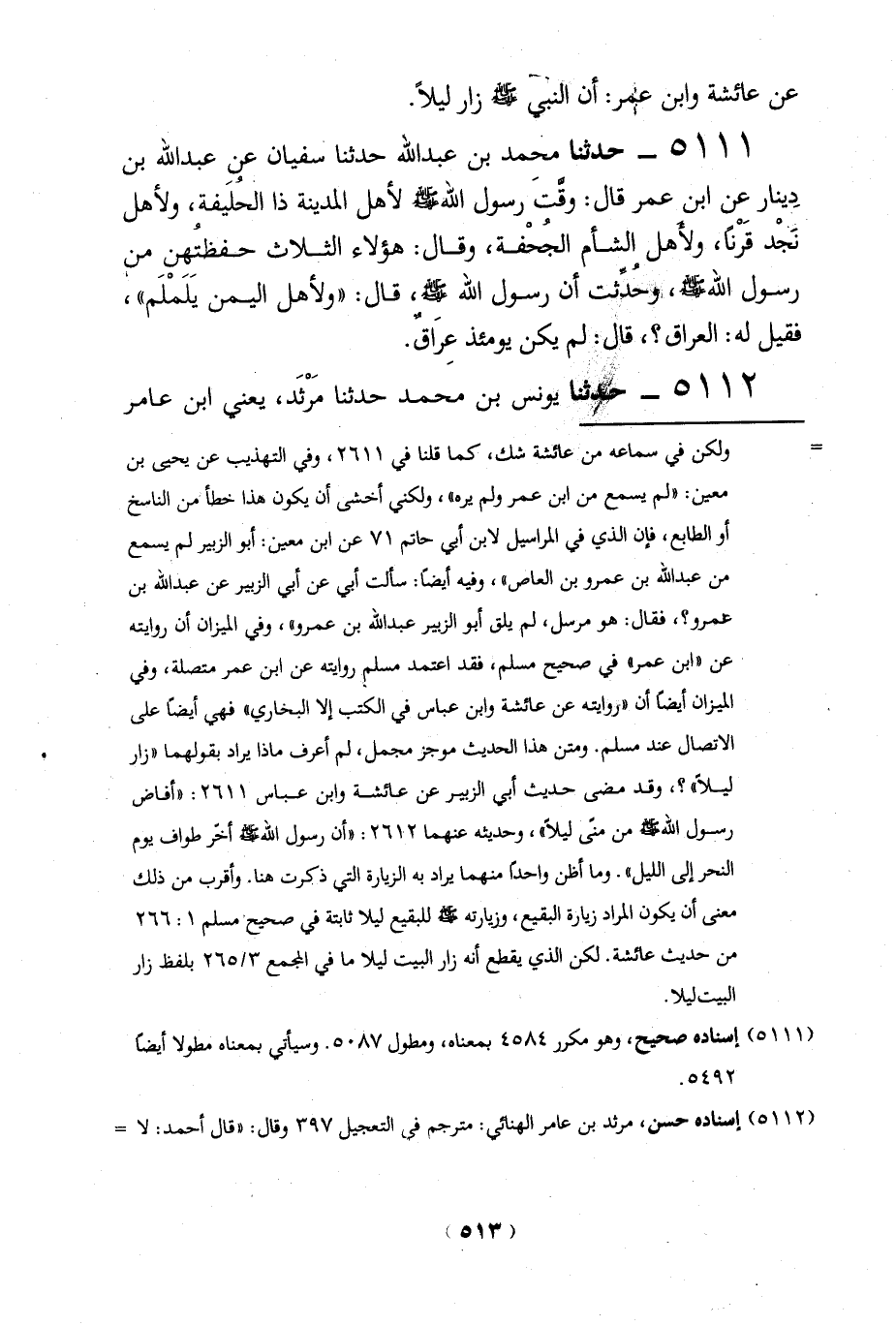 = ولكن في سماعه من عائشة شك، كما قلنا في 2611، وفي التهذيب عن يحيى بن معين: "لم يسمع من ابن عمر ولم يره"، ولكني أخشى أن يكون هذا خطأ من الناسخ أو الطابع، فإن الذي في المراسيل لابن أبي حاتم 71 عن ابن معين: أبو الزبير لم يسمع من عبد الله بن عمرو بن العاص"، وفيه أيضاً: سألت أبي عن أبي الزبير عن عبد الله بن عمرو؟، فقال: هو مرسل، لم يلق أبو الزبير عبد الله بن عمرو"، وفي الميزان أن روايته عن "ابن عمر" في صحيح مسلم، فقد اعتمد مسلم روايته عن ابن عمر متصلة، وفي الميزان أيضاً أن "روايته عن عائشة وابن عباس في الكتب إلا البخاري" فهي أيضاً على