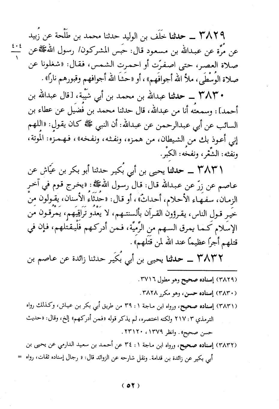 3831 - حدثنا يحيى بن أبي بُكير حدثنا أبو بكر بن عَيّاش عن عاصم عن زِرّ عن عبد الله قال: قال رسول الله - صلى الله عليه وسلم -: "يخرج قوم في آخر الزِمان، سفهاء الأحلام، أحداثُ"، أو قال: "حُدَثَاء ُالأسنان، يِقولون مِنْ خَيرِ قول الناس، يقرؤون القرآن بألسنتهم، لا يَعْدو تَرَاقيَهم، يمْرقون من