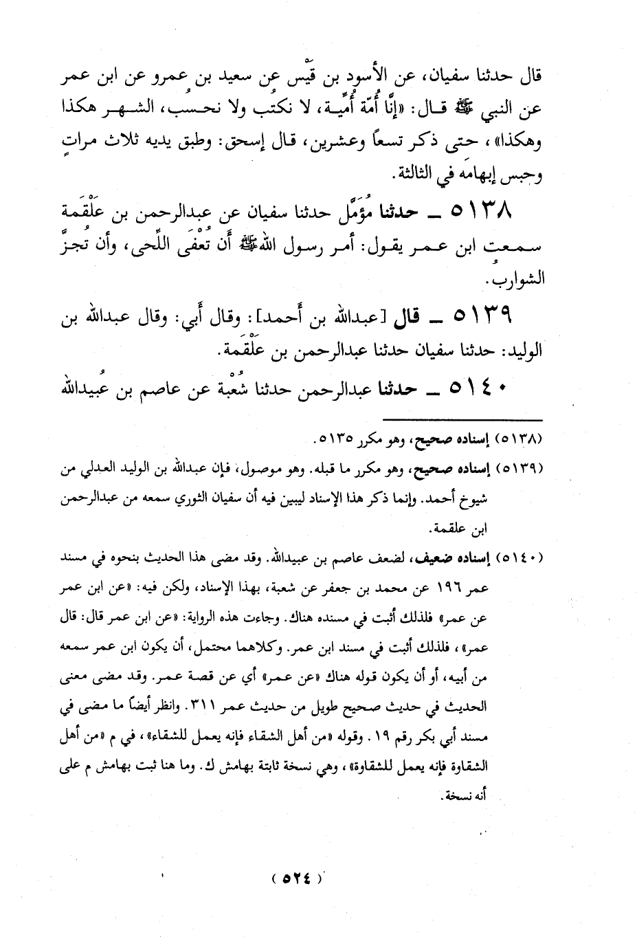(5139) إسناده صحيح، وهو مكرر ما قبله. وهو موصول، فإن عبد الله بن الوليد العدلي من شيوخ أحمد. وإنما ذكر هذا الإسناد ليبين فيه أن سفيان الثوري سمعه من عبد الرحمن ابن علقمة.