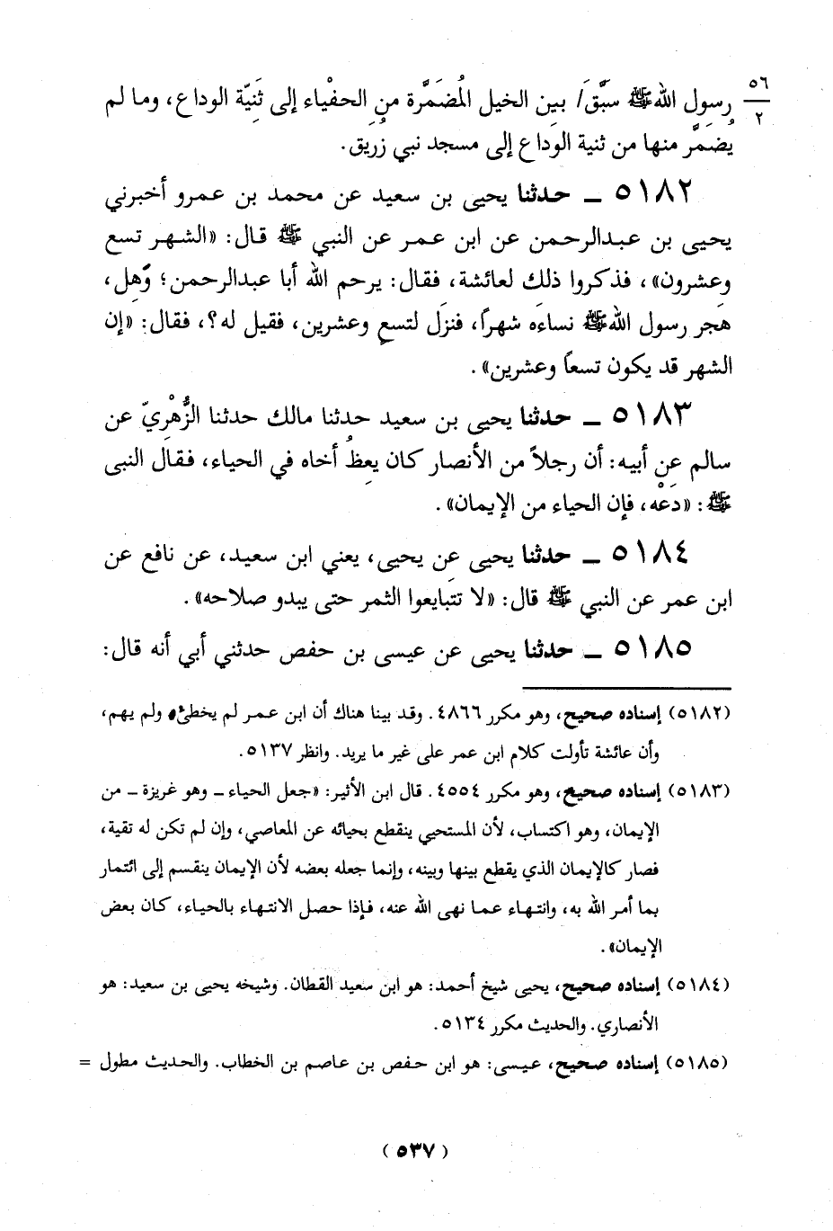 5183 - حدثنا يحيى بن سعيد حدثنا مالك حدثنا الزُّهْريّ عن سالم عِن أبيه: أن رجلاً من الأنصاركان يعظُ أخاه في الحياء، فقاَل النبي -صلي الله عليه وسلم -: "دَعْه، فإن الحياء من الإيمان".