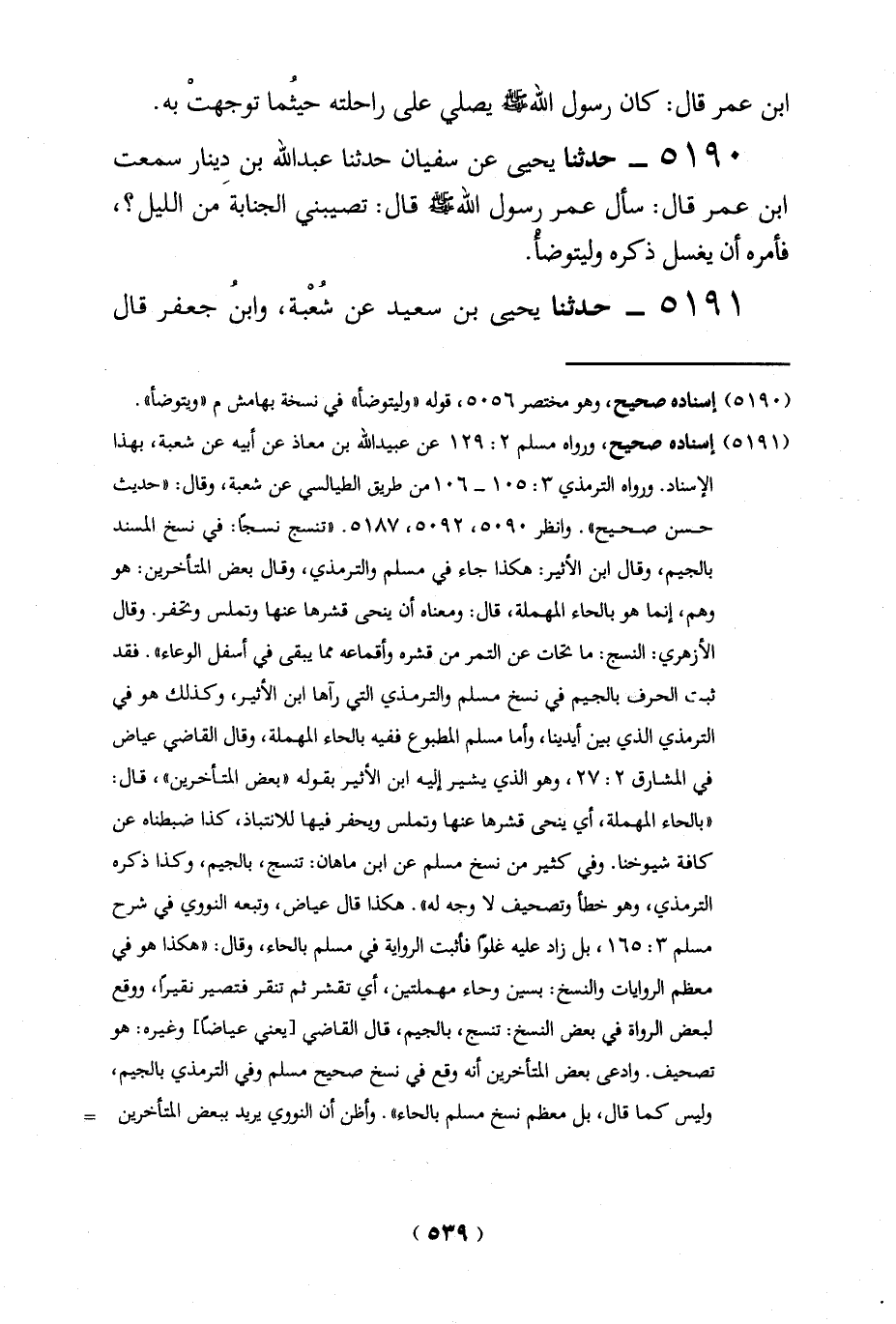 5190 - حدثنا يحيى عن سفيان حدثنا عبد الله بن دِينار سمعت ابن عمر قال: سأل عمر رسول الله -صلي الله عليه وسلم - قال: تصيبني الجنابة من الليل؟، فأمره أن يغسل ذكره وليتوضأْ.