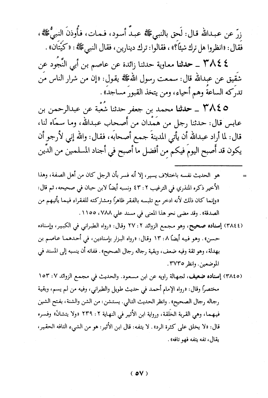 3844 - حدثنا معاوية حدثنا زائدة عن عاصم بن أبي النجُود عِن شَقيق عن عبد الله قال: سمعت رسول الله - صلى الله عليه وسلم - يقولِ: "إن من شرار الناس من تدرَكه الساعةُ وهم أحياء، ومن يتخذ القبورَ مساجد".
