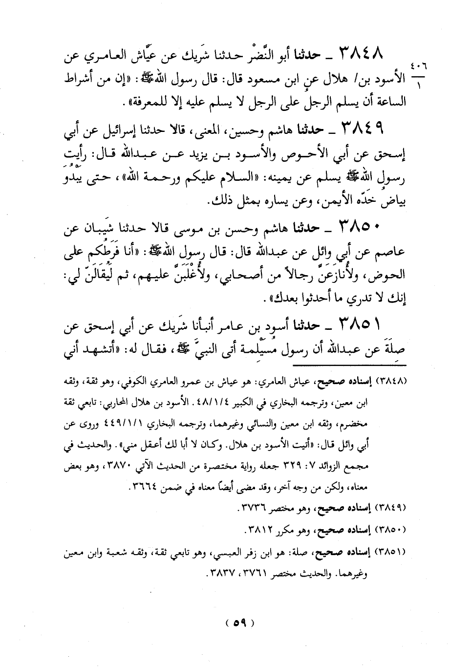 3848 - حدثنا أبو النَّضْر حدثنا شَريك عن عَيَّاش العامري عن الأسود بن/ هلال عني ابن مسعود قال: قال رسول الله - صلى الله عليه وسلم -: "إن من أشراط الساعة أن يسلم الرجل على الرجل لا يسلم عليه إلا للمعرفة".