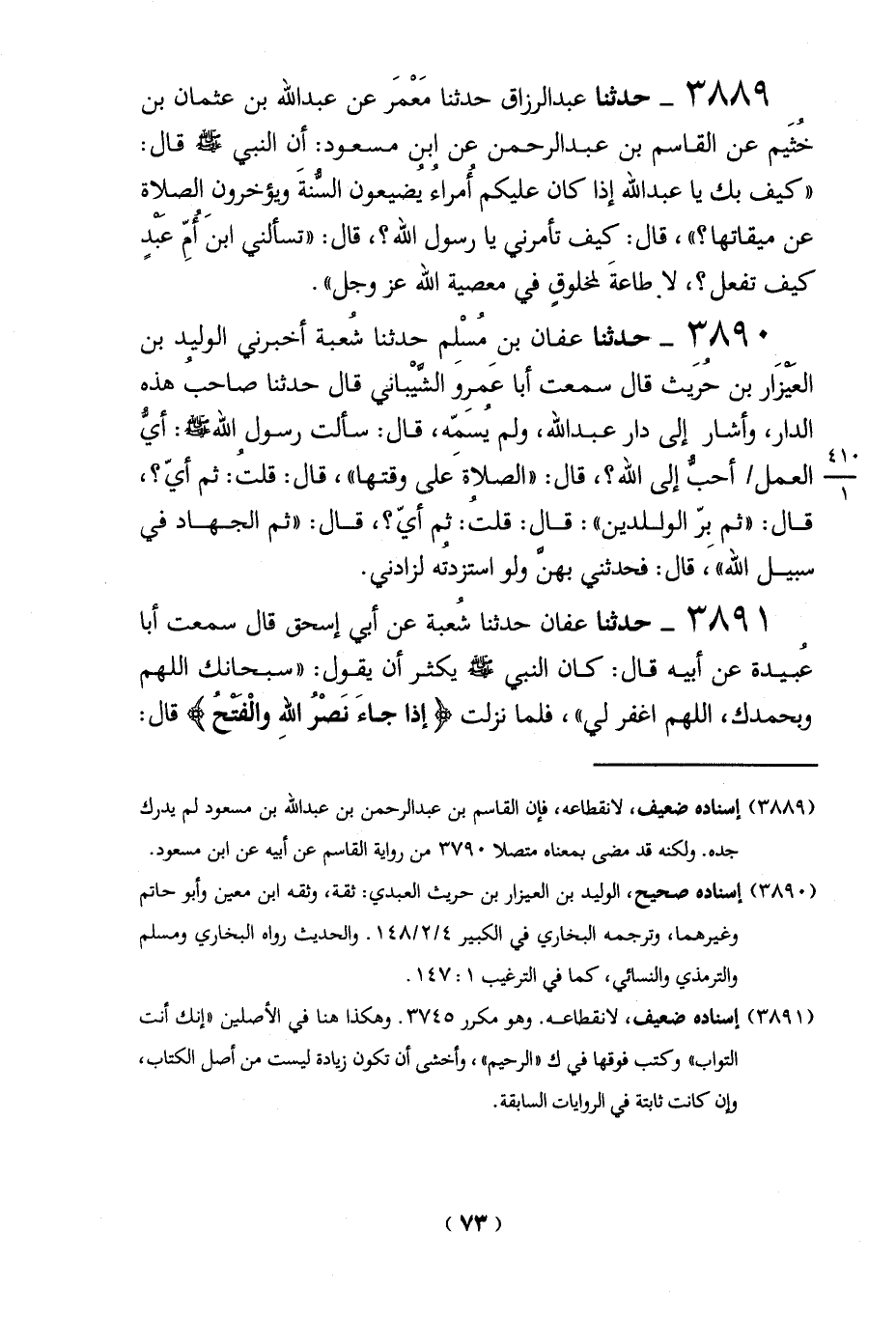 (3889) إسناده ضعيف، لانقطاعه، فإن القاسم بن عبد الرحمن بن عبد الله بن مسعود لم يدرك جده. ولكنه قد مضى بمعناه متصلا 3790 من رواية القاسم عن أبيه عن ابن مسعود.