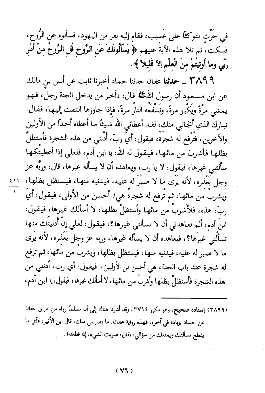 3899 - حدثنا عفان حدثنا حماد أخبرنا ثابت عن أنس بن مالك عن ابن مسعود أن رسول الله - صلى الله عليه وسلم - قال: "آخرُ من يدخل الجنة رجلٌ، فهو يمشي مرَّةً ويَكْبو مرةً، وتَسْفَعُه النارُ مرةً، فإذا جاوزها التفت إليها، فقال: تبارك الذي أنجاني منكِ، لقد أعطانى الله شَيئاً ما أعطاه أحداً من الأولين والآخرين، فتُرْفع له شجرٌ:، فيقول: أيْ ربّ، أَدْنني من هذه الشجرة فأستظلَّ بظلها فأشربَ من مائها، فيقول له الله: يا ابن آدم، فلعلي إذا أعطيتُكها سألتني غيرها، فيقِوِل: لا يا رب، ويعاهده أن لا يسأله غيرها، قال: ورُّبه عز وجل يَعْذِره، لأنه يَرَى ما لا صبْرَله عليه، فيدنيه منها، فيستظل بظلها، ويشربُ من مائها، ثم تُرفع له شجرٌ: هي/ أحسن من الأولى، فيقول: أيْ ربّ، هذه، فلأَشربْ من مائها وأستظلَّ بظلها، لا أسألك غيرها، فيقول: ابنَ آدم، ألِم تعاهدني أن لا تسألني غيرها؟، فيقول: لعلي إِنْ أَدنيتُك مِنها تسألُني غيرها؟، فيعاهده أن لا يسأله غيرها، وربه عز وجل يعْذره، لأنه يرى ما لا صبر له عليه، فيدنيه منها، فيستظل بظلها، ويشربُ من مَائها، ثم ترفع