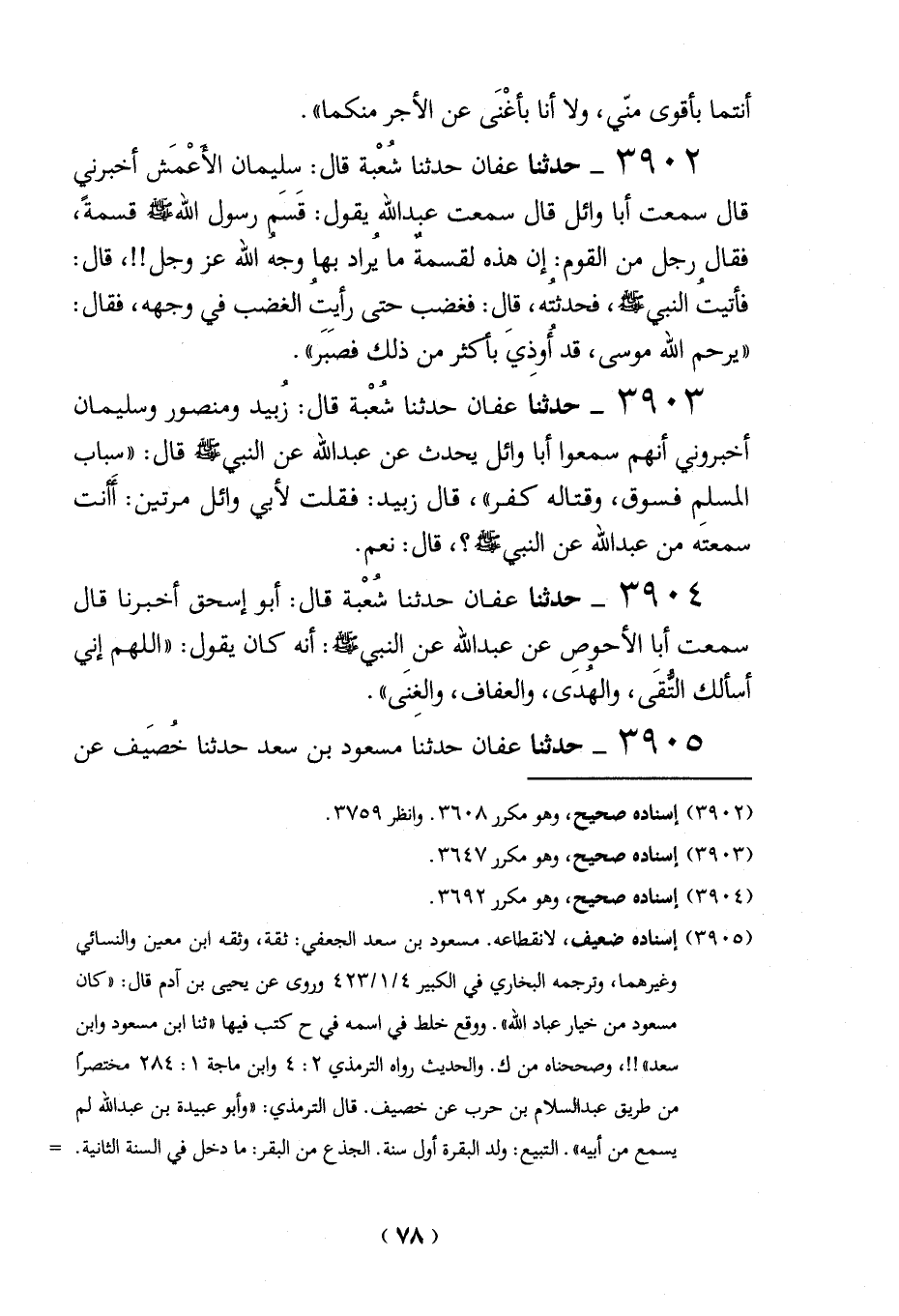 3904 - حدثنا عفان حدثنا شُعْبة قال: أبو إسحق أخبرنا قال سمعت أبا الأحوص عن عبد الله عن النبي - صلى الله عليه وسلم -: أنه كان يقول: "اللهم إني أسألك التُّقَى، والهُدَى، والعفاف، والغِنَى".