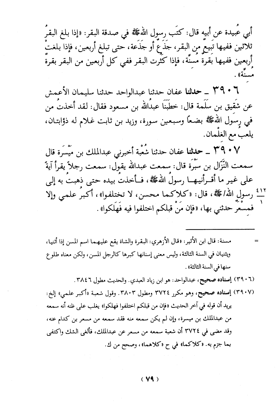 أبي عُبيدة عنِ أبيه قال: كتَب رِسول الله - صلى الله عليه وسلم - في صدقة البقر: "إذا بلغ البقرُ ثلاثين ففيها تَبِيعٌ من البقر، جَذَعٌ أو جَذَعة، حتى تبلغ أربعين، فإذا بلغتْ أربعين ففيها بَقرةٌ مُسِنَّة، فإذا كَثُرت البقر ففي كل أربعين من البقر بقرةٌ مُسِنَّة".