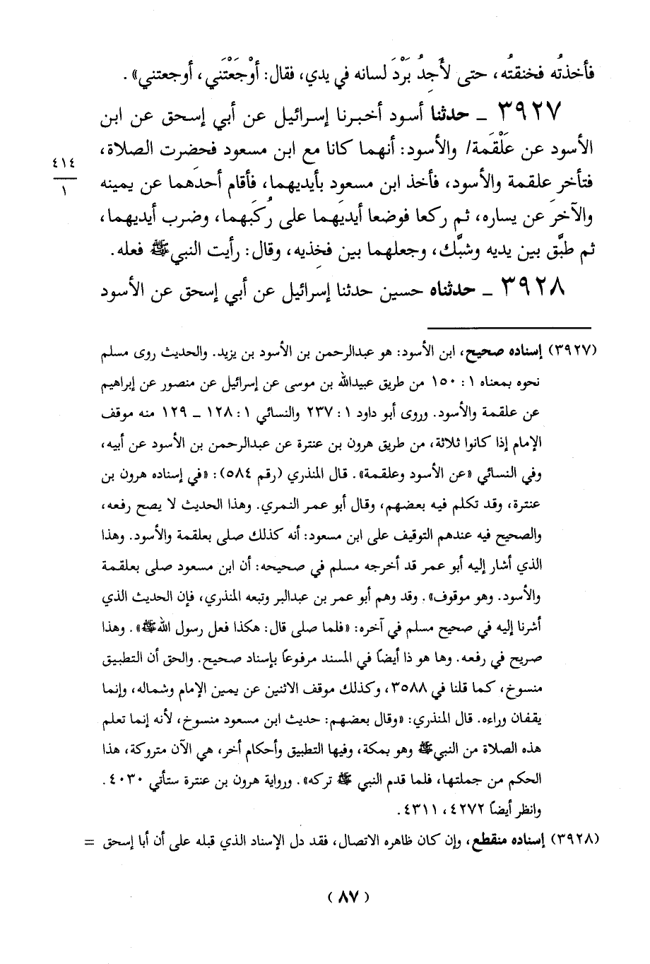 3927 - حدثنا أسود أخبرنا إسرائيل عن أبي إسحق عن ابن الأسود عن عَلْقَمة والأسود: أنهما كانا مع ابن مسعود فحضرت الصلاة، فتأخر عِلقمة والأسود، فأخذ ابن مسعود بأيديهما، فأقام أحدَهما عن يمينه والآخر عن يساره، ثم ركعا فوضعا أيديَهما على رُكَبهما، وضرب أيديهما، ثم طبَّق بين يديه وشبَّك، وجعلهما بين فخِذيه، وقال: رأيت النبي-صلي الله عليه وسلم- فعله.
