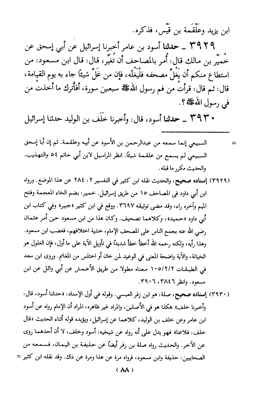 3929 - حدثنا أسود بن عامر أحبرنا إسرائيل عن أبي إسحق عن خُمَيْر بن مالك قال: أُمر بالمصاحف أن تُغَيَّر، قال: قال ابن مسعود: من استطاع منكم أن يَغُلَّ مصحفه فلْيَغُلّه، فإن من غَلَّ شيئاً جاء به يوم القيامة، قال: ثم قال: قرأتُ من فم رسول الله - صلى الله عليه وسلم - سبعين سورة، أفأَترك ما أخذتُ من في رسول الله - صلى الله عليه وسلم -؟.