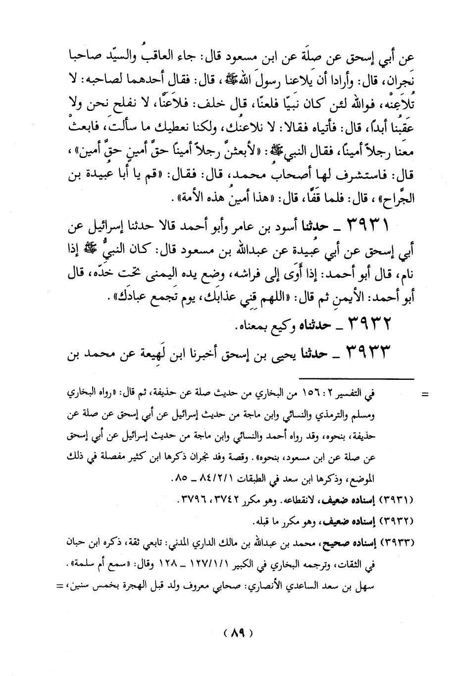 عن أبي إسحق عن صلَة عن ابن مسعود قال: جاء العاقبُ والسيّد صاحبا نَجران، قال: وأرادا أن يَلاعنا رسولَ الله - صلى الله عليه وسلم -، قال: فقال أحدهما لصاحبه: لا تُلاَعنْه، فوالله لئن كان نَبيّا فلعنّا، قال خلف: فلاَعنَّا، لا نفلح نحن ولا عَقبُنا أبداً، قال: فأتياه فقالا: لا نلاعنُك، ولكنا نعطيك ما سألتَ، فابعثْ معَنا رجلاً أميناً، فقال النبي - صلى الله عليه وسلم -: "لأبعثنَّ رجلاً أميناً حقَّ أمينٍ حقَّ أمين"، قال: فاستشرف لها أصحاب محمد، قال: فقال: "قم يا أبا عبيدة بن الجَّراح"، قال: فلما قَفَّا، قال: "هذا أمينُ هذه الأمة".