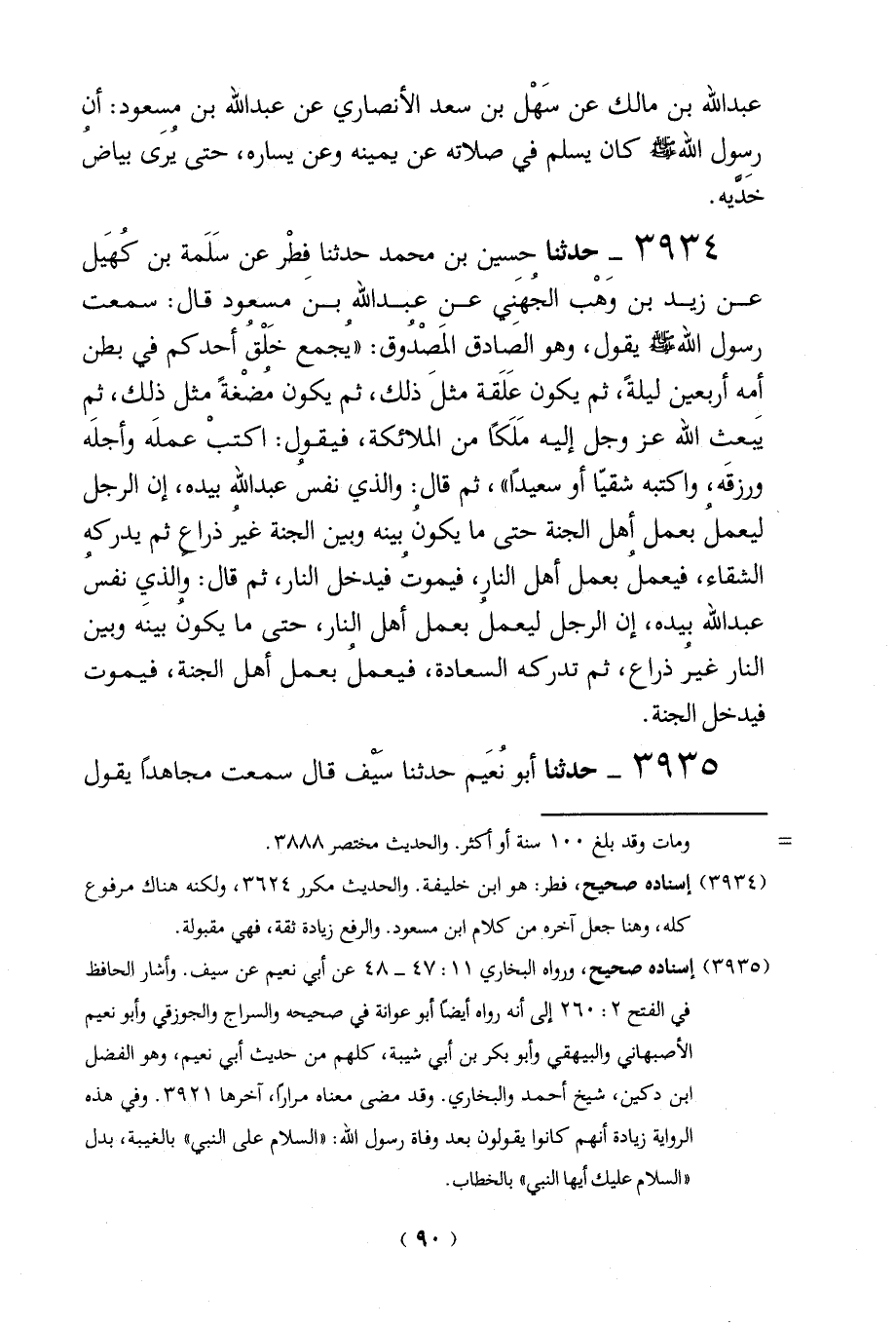 3934 - حدثنا حسين بن محمد حدثنا فِطرْ عن سَلَمة بن كُهَيل عن زيد بن وَهْب الجُهَني عن عبد الله بن مسعود قال: سمعت رسول الله - صلى الله عليه وسلم - يقول، وهو الصَادق المَصْدُوق: "يُجمع خَلْق أحدكم في بطن أمه أربعين ليلةً، ثم يكون عَلَقة مثلَ ذلك، ثم يكون مُضغةً مثل ذلك، ثم