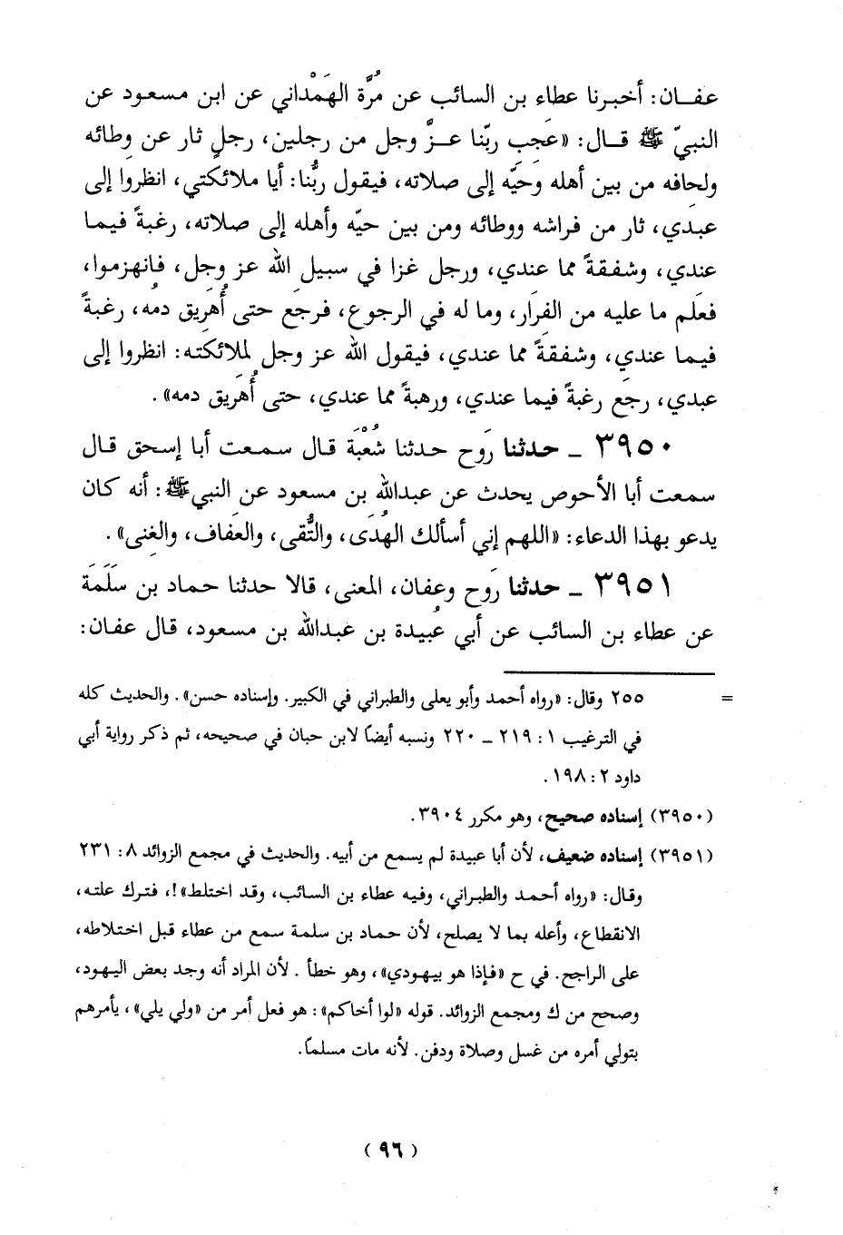عفان: أخبرنا عطاء بن السائب عن مُرَّة الهَمْداني عن ابن مسعود عن النبيّ - صلى الله عليه وسلم - قال: "عَجب ربّنا عز وجل من رجلين، رجل ثار عن وِطائه ولحِافه من بين أهله وَحَيّه إلى صلاته، فيقول ربُّنا: أيا ملائكتي، انظروا إلى عبدي، ثار من فراشه ووطائه ومن بين حيّه وأهله إلى صلاته، رغبةً فيما عندي، وشفقةً مما عندي، ورجل غزا في سبيلِ الله عزوجل، فانهزموا، فعَلم ما عليه من الفِرَار، وما له في الرجوع، فرجع حتى أُهَرِيق دمُه، رغبةً فيما عنديِ، وشفقةً مما عندي، فيقول الله عز وجل لملائكته: انظروا إلى عبدي، رجع رغبةً فيما عندي، ورهبةً مما عندي، حتى أهَريق دمه".