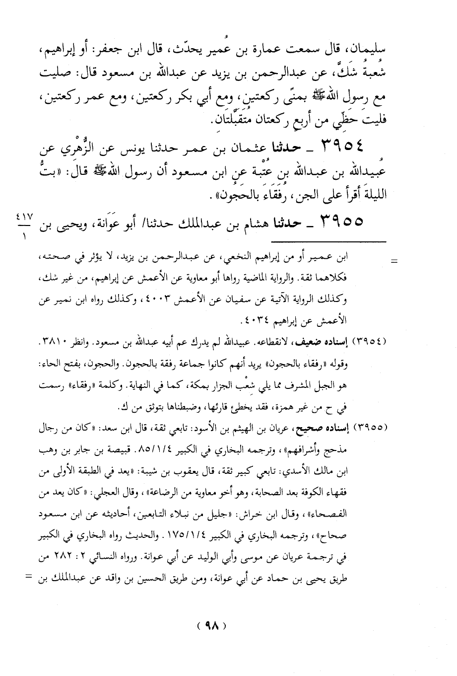 = ابن عمير أو من إبراهيم النخعي، عن عبد الرحمن بن يزيد، لا يؤثر في صحته، فكلاهما ثقة. والرواية الماضية رواها أبو معاوية عن الأعمش عن إبراهيم، من غير شك، وكذلك الرواية الآتية عن سفيان عن الأعمش 4003، وكذلك رواه ابن نمير عن الأعمش عن إبراهيم 4034.