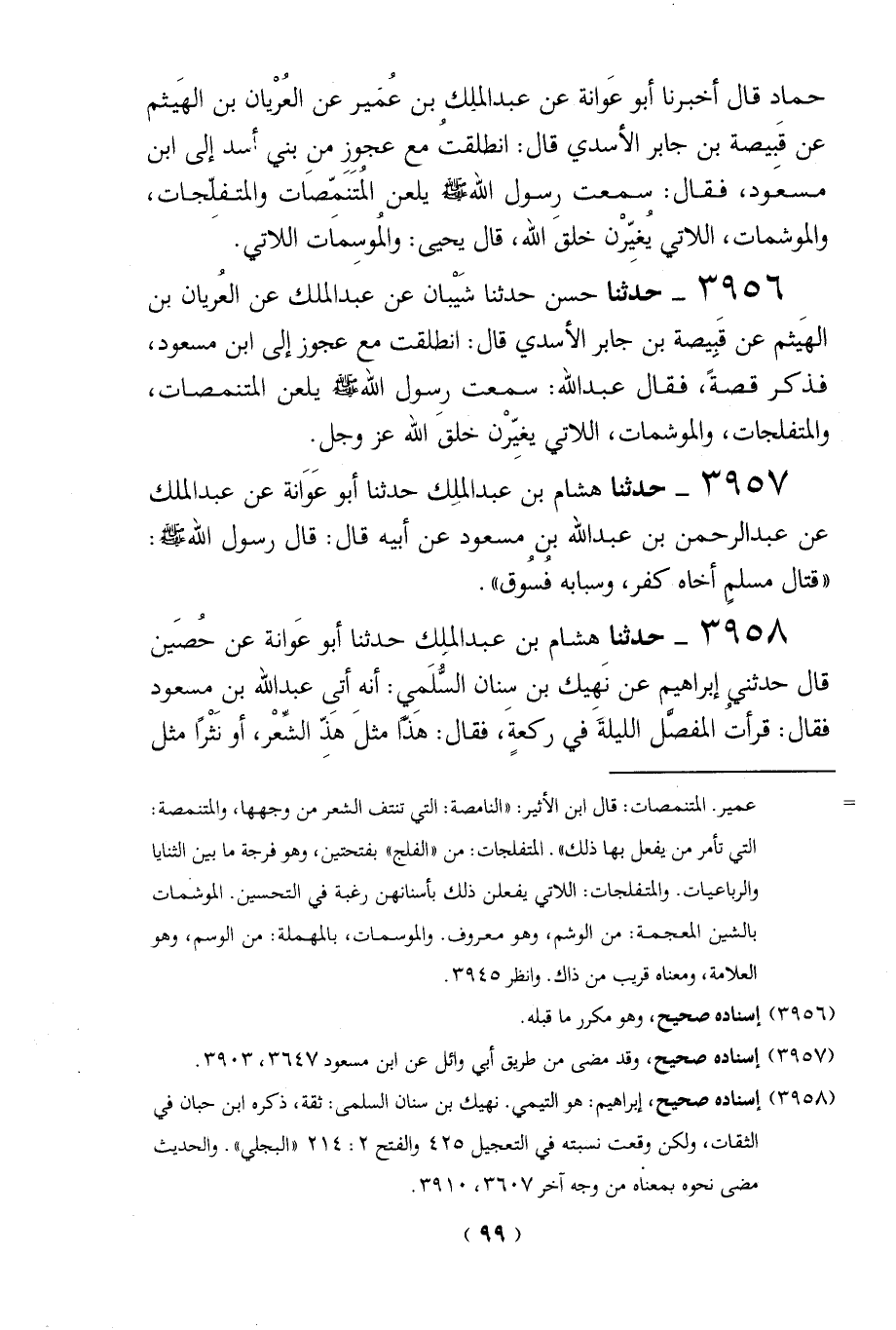 حماد قال أخبرنا أبو عَوانة عن عبد الملك بن عُمَير عن العُرْيان بن الهَيثم عن قَبِيصة بن جابر الأسدي قال: انطلقتُ مع عجوز من بني أسد إلى ابن مسعود، فقال: سمعت رسول الله - صلى الله عليه وسلم - يلعن المُتَنَمّصَات والمتفِلّجات، والموشمات، اللاتي يُغيِّرْن خلقَ الله، قال يحيى: والمُوسِمَات اللاتي.