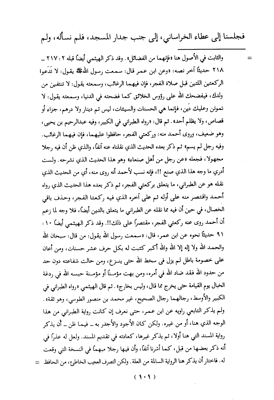 وفيه رجل لم يسم" ثم ذكر بعده الحديث الذي نقلناه عنه آنفاً، والذي ظن أن فيه رجلاً مجهولا، فجعله "عن رجل من أهل صنعاء" وهو هذا الحديث الذي نشرحه. ولست أدري ما وجه هذا الذي صنع!!، فإنه نسب لأحمد أنه روى منه، أي من الحديث الذي نقله هو عن الطبراني، ما يتعلق بركعتي الفجر، ثم ذكر بعده هذا الحديث الذي رواه أحمد واقتصر منه على أوله ثم على آخره الذي فيه ركعتا الفجر، وحذف باقي الخصال، في حين أن فيه بما نقله عن الطبراني ما يتعلق بالدين أيضاً، فلا وجه لما زعم أن أحمد روى عنه ركعتي الفجر، مقتصرآ على ذلك!!. وقد ذكر الهيثمي أيضاً 10: 91 حديثاً نحوه عن ابن عمر، قال: "سمعت رسول الله -صلي الله عليه وسلم-يقول: من قال: سبحان الله والحمد الله ولا اله ألا الله والله أكبر كتبت له بكل حرف عشر حسنات، ومن أعان على خصومة باطل لم يزل في سخط الله حتى ينزع، ومن حالت شفاعته دون حد من حدود الله فقد ضاد الله في أمره، ومن بهت مؤمناً أو مؤمنة حبسه الله في ردغة الخبال يوم القيامة حتى يخرج مما قال، وليس بخارج". ثم قال الهيثمي "رواه الطبراني في الكبير والأوسط، رجالهما رجال الصحيح، غير محمد بن منصور الطوسي، وهو ثقة".