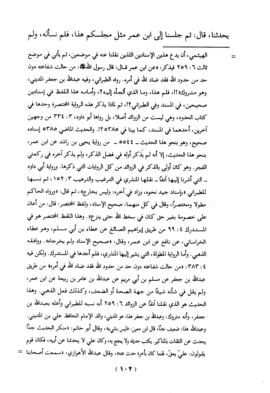بنحو هذا الحديث، إلا أنه لم يَذكر أوله في فضل الذكر، ولم يذكرآخره في ركعتي الفجر. وهو كان أولى بالذكر في الزوائد من كل الروايات التي ذكرها. ورواية أبي داود -التي أشرنا إليهاآنفما- نقلها المنذري في الترغيب والترهيب 3: 152، ثم نسبها للطبراني "بإسناد جيد نحوه، وزاد في آخره: وليس بخارج"، ثم قال: "ورواه الحاكم مطولاً ومختصراً، وقال في كل منهما: صحيح الإسناد، ولفظ المختصر: قال: من أعان على خصومة بغير حق كان في سخط الله حتى ينزع". وهذا اللفظ المختصر هو في المستدرك 4: 99 من طريق إبراهيم الصائغ عن عطاء بن أبي مسلم، وهو عطاء الخراساني، عن نافع عن ابن عمر، وقال: "صحيح الإسناد ولم يخرجاه". ووافقه الذهبي. وأما الرواية المطولة، التي يشير إليها المنذري، فلم أجدها في المستدرك. ولكن فيه 4: 383: "من حالت شفاعته دون حد من حدود الله فقد ضاد الله في أمره" من طريق عبد الله بن جعفر عن مسلم بن أبي مريم عن عبد الله بن عامر بن ربيعة عن ابن عمر، ولم يقل في شأنه شيئاً من جهة الصحة أو الضعف، وكذلك فعل الذهبي. وهذا الحديث هو الذي نقلنا آنفاً عن الزوائد 6: 259 أنه نسبه للطبراني وأعله بعبد الله بن جعفر، وأنه متروك: وعبد الله بن جعفر هذا: هو المديني، والد الإِمام الحافظ علي بن المديني.