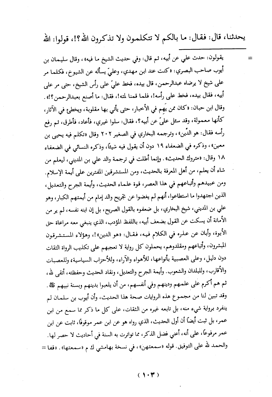 ومن عبيدهم وأتباعهم في هذا العصر، قوة علماء الحديث، وأيمة الجرح والتعديل، الذين اجتهدوا ما استطاعوا، أنهم لم يغضوا عن تجريح والد إمام من أيمتهم الكبار، وهو علي بن المديني، شيخ البخاري، بل ضعفوه بالقول الصريح، بل إن ابنه نفسه، لم ير من الأمانة أن يسكت عن القول بضعف أبيه، باللفظ المؤدب، الذي ينبغي معه مراعاة حق الأبوة، وأبان عن عذره في الكلام فيه، فقال: "هو الدين"!، وهؤلاء المستشرقون المبشرون، وأتباعهم ومقلدوهم، يحملون كل رواية لا تعجبهم على تكذيب الرواة الثقات دون دليل، وعلى العصبية بأنواعها, للأهواء والآراء، وللأحزاب السياسية، وللعصبات والأقارب، وللبلدان والشعوب. وأيمة الجرح والتعديل، ونقاد الحديث وحفظته، أتقى لله،