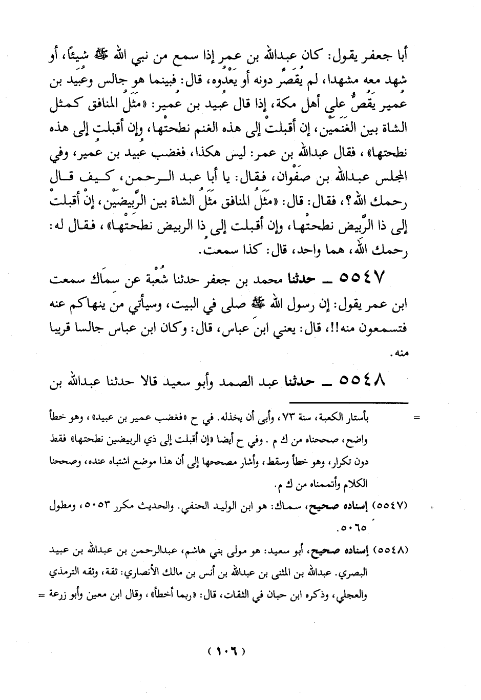 أبا جعفر يقول: كان عبد الله بن عمر إذا سمع من نبي الله - صلى الله عليه وسلم - شيئاً، أو شهد معه مشهدا، لم يُقَصِّر دونه أو يَعْدُوه، قال: فبينما هو جالس وعُبَيد بن عُمير يَقُصُّ على أهل مكة، إذا قال عُبيد بن عُمير: "مَثَلُ المنافق كمثل الشاة بين الغَنَمين، إن أقبلتْ إلى هذه الغنم نطحتْها، وإن أقبلت إلى هذه نطحتها"، فقال عبد الله بن عمر: ليس هكذا، فغضب عُبيد بن عُمير، وفي المجلس عبد الله بن صَفْوان، فقال: يا أبا عبد الرحمن، كيف قال رحمك الله؟، فقال: قال: "مَثَلُ المنافق مَثَلُ الشاة بين الرَّبِيضين، إنْ أقبلتْ إلى ذا الرَّبيض نطحتْها، وإن أقبلت إلى ذا الربيض نطحتْها"، فقال له: