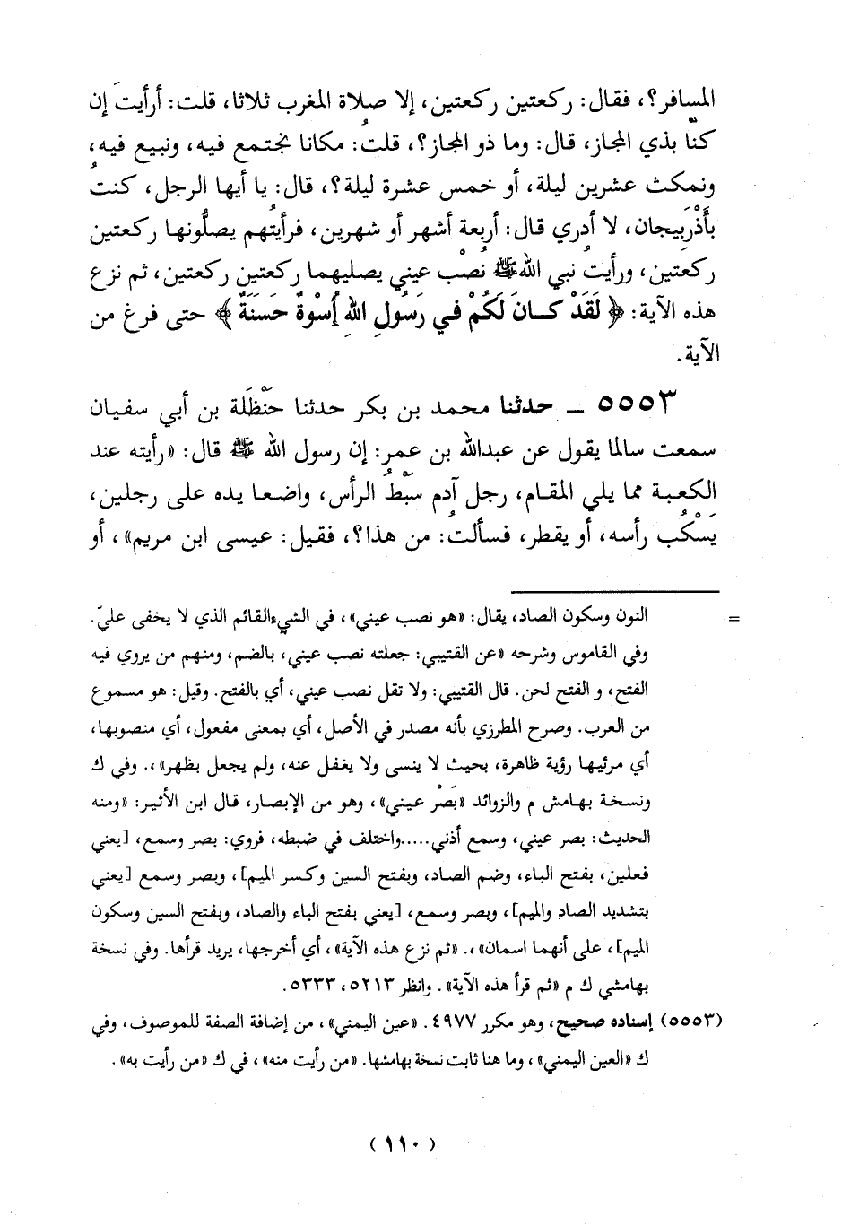 5553 - حدثنا محمد بن بكر حدثنا حنظَلة بن أبي سفيان سمعت سالما يقول عن عبد الله بن عمر: إن رسول الله -صلي الله عليه وسلم - قال: "رأيته عند الكعبة مما يلي المقام، رجل آدم سبطُ الرأس، واضعا يده على رجلين، يَسْكب رأسه، أو يقطر، فسألتُ: من هذا؟، فقيل: عيسى ابن مريم"، أو