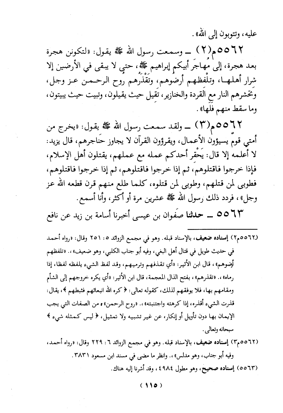 5562 م (2) - وسمعت رسول الله -صلي الله عليه وسلم - يقول: "لتكونن هجرة بعد هجرة، إلى مُهاجَر أبيكم إبراهيم - صلى الله عليه وسلم -، حتي لا يبقى في الأرضين إلا شِرار أهلها، وتلْفظهم أرضوهم، وتَقْذَرهم روح الرحمن عز وجل، وتحشرهم النار معٍ اَلقردة والخنازير، تَقيل حيث يقيلون، وتبيت حيث يبيتون، وما سقط منهم فلها".