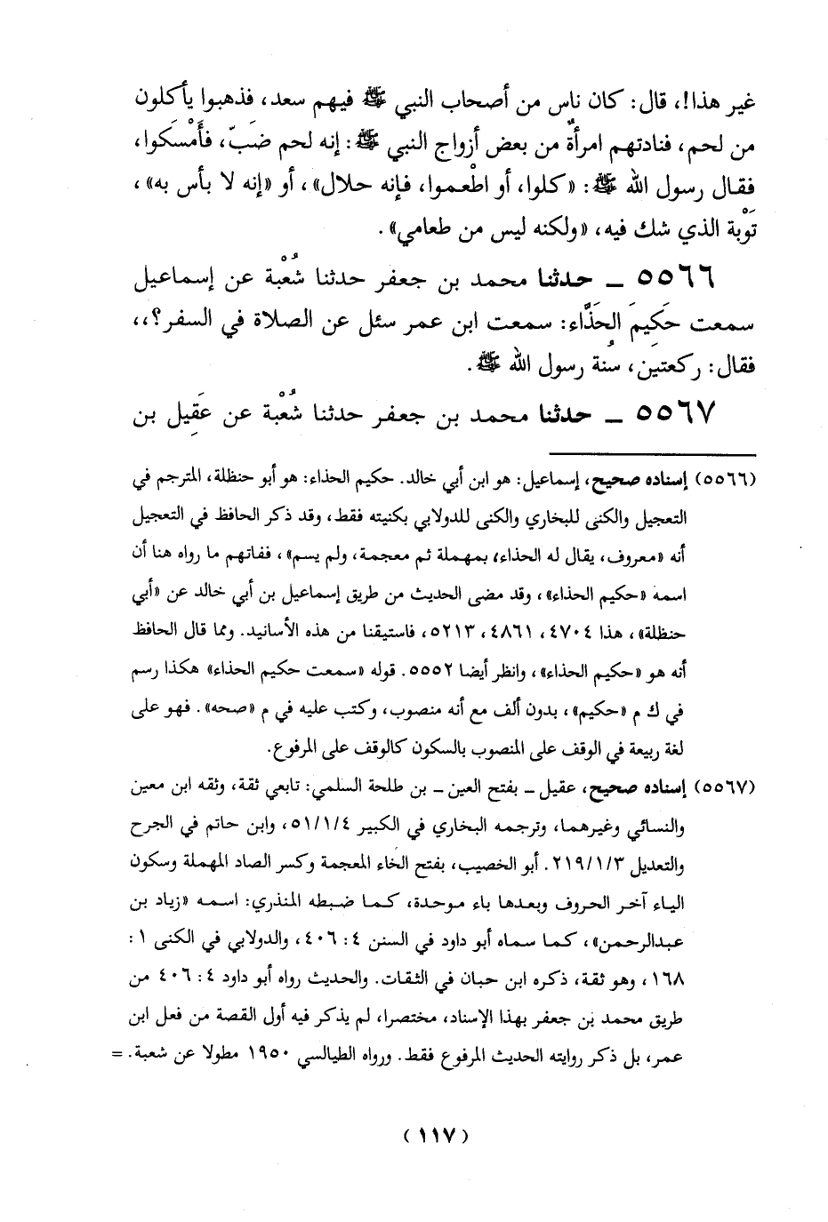 5566 - حدثنا محمد بن جعفر حدثنا شُعْبة عن إسماعيل سمعت حَكيمَ الحَذَّاء: سمعت ابن عمر سئل عن الصلاة في السفر؟،، فقال: ركعتيَن، سنة رسول الله -صلي الله عليه وسلم -.