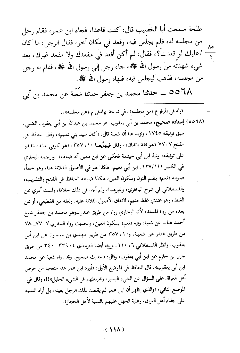 (5568) إسناده صحيح، محمد بن أبي يعقوب. هو محمد بن عبد الله بن أبي يعقوب الضبي، سبق توثيقه 1745، ونزيد هنا أن شُعبة قال: "كان سيد بني تميم"، وقال الحافظ في الفتح 7: 77 "هو ثقة باتفاق"، وقال فيها يضا 10: 357: "هو كوفي عابد، اتفقوا على توثيقه، وشذ ابن أبي خيثمة فحكى عن ابن معين أنه ضعفه". وترجمه البخاري في الكبير 1/ 1/127 ابن أبي نعيم: هكذا هو في الأصول الثلاثة هنا، وهو خطأ، صوابه "نعم" بضم النون وسكون العين، هكذا ضبطه الحافظ في الفتح والتقريب، والقسطلاني في شرح البخاري، وغيرهما ,ولم أجد في ذلك خلافا, ولست أدري ممن