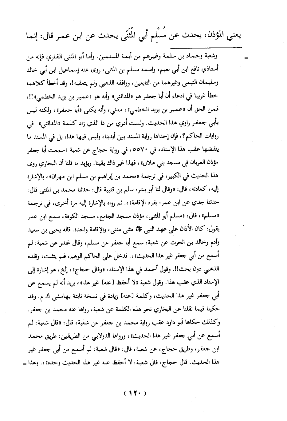 ولكنه ليس بأبي جعفر راوي هذا الحديث. ولست أدري من ذا الذي زاد كلمة "المدائني" في روايات الحاكم؟، فإن إحداها رواية المسند بين أيدينا, وليس فيها هذا، بل في المسند ما ينقضها عقب هذا الإسناد، في 5570، في رواية حجاج عن شُعبة "سمعت أبا جعفر مؤذن العربان في مسجد بني هلال"، فهذا غير ذاك يقينا. ويؤيد ما قلنا أن البخاري روى هذا الحديث في الكبير، في ترجمة "محمد بن إبراهيم بن مسلم ابن مهران"، بالإشارة إليه، كعادته، قال: "وقال لنا أبو بشر: سلم بن قتيبة قال: حدثنا محمد بن المثنى قال: حدثنا جدي عن ابن عمر: يفرد الإقامة". ثم رواه بالإشارة إليه مرة أخرى، في ترجمة "مسلم"، قال: "مسلم أبو المثنى، مؤذن مسجد الجامع، مسجد الكوفة، سمع ابن عمر يقول: كان الأذان على عهد النبي -صلي الله عليه وسلم -مثنى مثنى، والإقامة واحدة. قاله يحيى بن سعيد