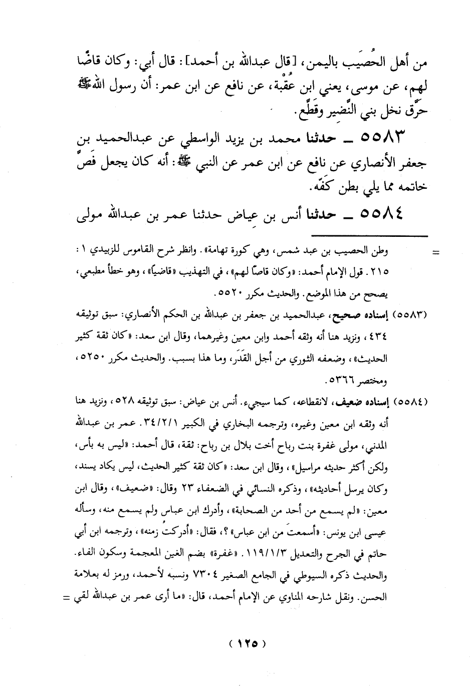 من أهل الحُصَيب باليمن، [قال عبد الله بن أحمد]: قال أبي: وكان قاضَّا لهم، عن موسى، يعني ابن عُقْبة، عن نافع عن ابن عمر: أن رسول الله -صلي الله عليه وسلم - حَرَّق نخل بني النَّضِير وقَطَّع.