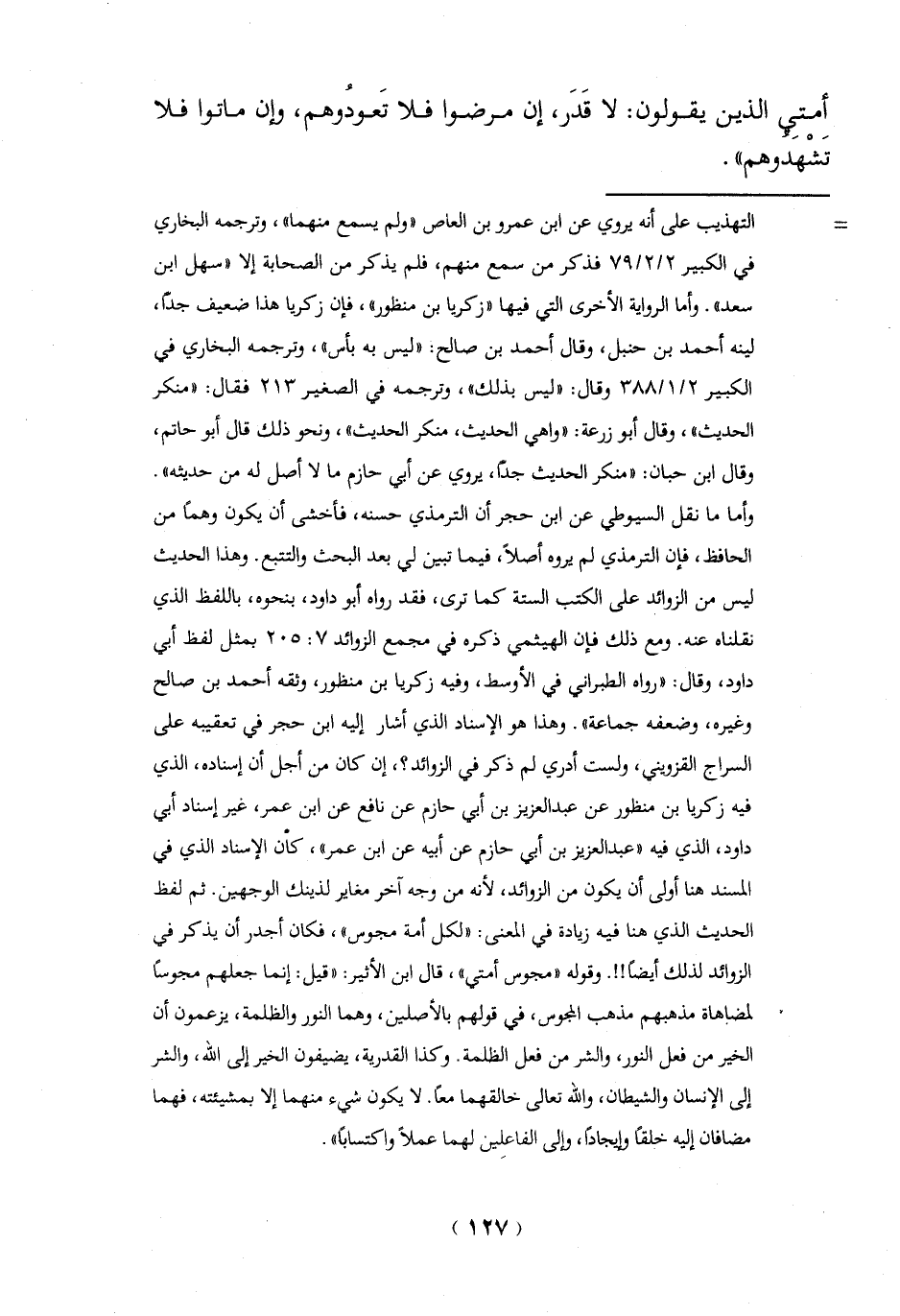 السراج القزويني، ولست أدري لم ذكر في الزوائد؟، إن كان من أجل أن إسناده، الذي فيه زكريا بن منظور عن عبد العزيز بن أبي حازم عن نافع عن ابن عمر، غير إسناد أبي داود، الذي فيه "عبد العزيز بن أبي حازم عن أبيه عن ابن عمر"، كان الإسناد الذي في المسند هنا أولى أن يكون من الزوائد؛ لأنه من وجه آخر مغاير لذينك الوجهين. ثم لفظ الحديث الذي هنا فيه زيادة في المعنى: "لكل أمة مجوس"، فكان أجدر أن يذكر في الزوائد لذلك أيضا!!. وقوله "مجوس أمتي"، قال ابن الأثير: "قيل: إنما جعلهم مجوساً لمضاهاة مذهبهم مذهب المجوس، في قولهم بالأصلين، وهما النور والظلمة، يزعمون أن الخير من فعل النور، والشر من فعل الظلمة. وكذا القدرية، يضيفون الخير إلى الله، والشر إلى الإنسان والشيطان، والله تعالى خالقهما معاً. لا يكون شيء منهما إلا بمشيئته، فهما مضافان إليه خلقاً وإيجاداً، وإلى الفاعلِين لهما عملاً واكتساباص".