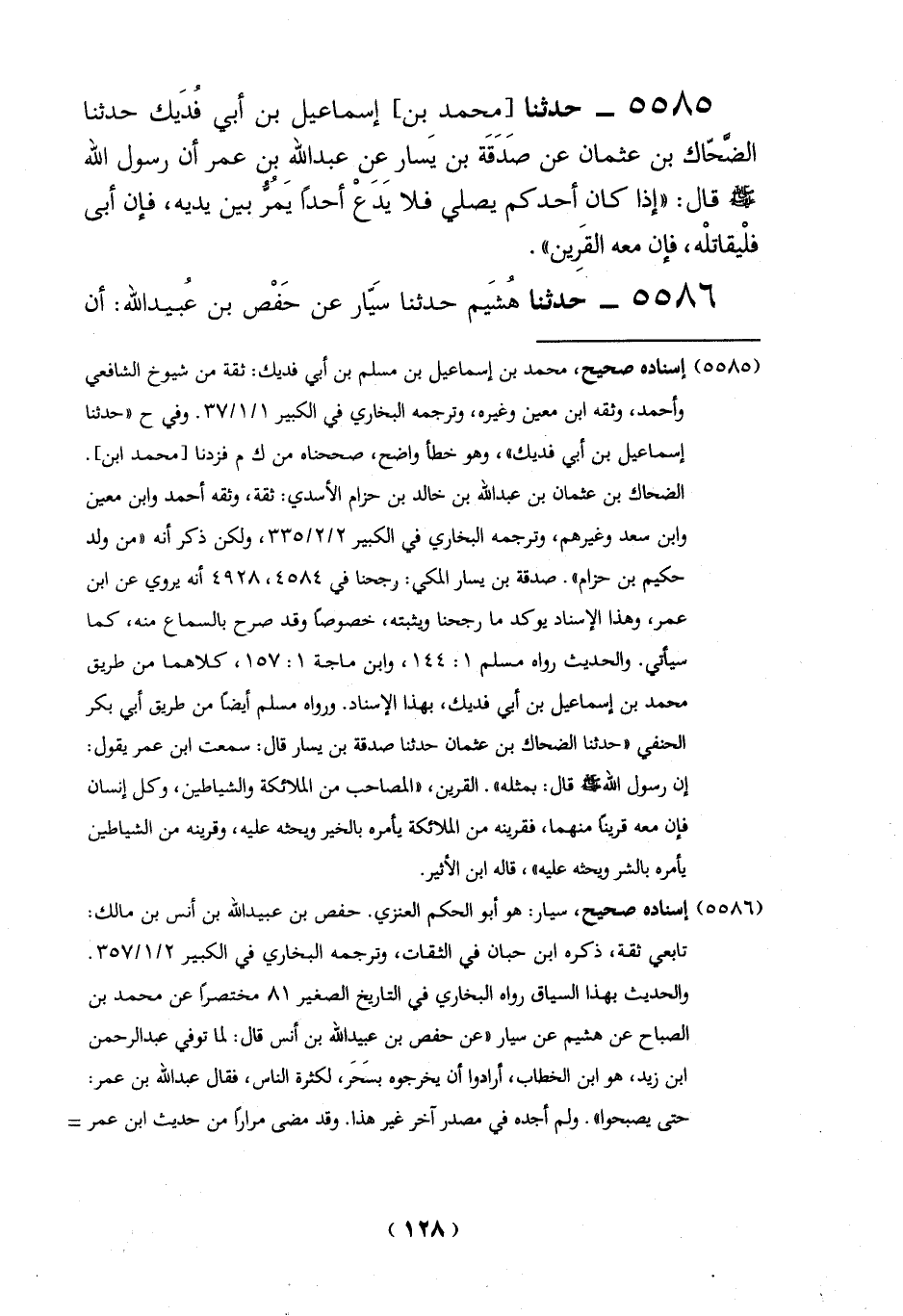 5585 - حدثنا [محمد بن]، إسماعيل بن أبي فُدَيك حدثنا الضَّحّاك بن عثمان عن صَدَقَة بن يَسار عِن عبد الله بن عمر أن رسول الله - صلى الله عليه وسلم - قال: "إذا كان أحدكم يصلي فلا يَدعْ أحداً يَمُرُّ بين يديه، فإن أبي فلْيقاتلْه، فإن معه القَرِين".