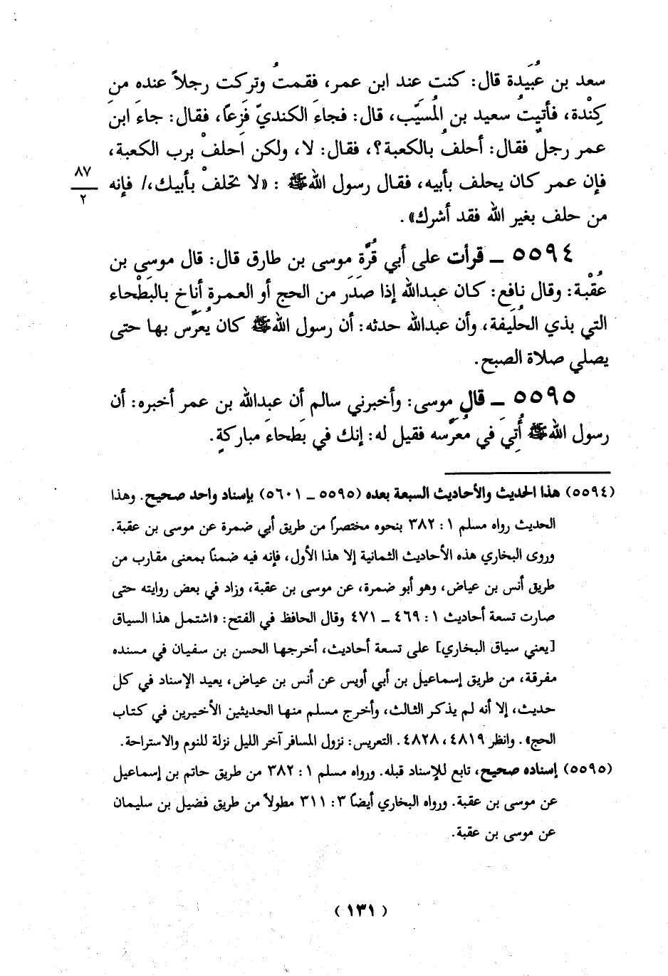 5594 - قرأت على أبي قُرَّة موسى بن طارق قال: قال موسى بن عُقْبة: وقال نافِع: كان عبد الله إذا صَدَر من الحج أو العمرة أناخ بالبَطْحاء ْالتي بذي الخُليفة،- وأن عبد الله حدثه: أن رسول الله -صلي الله عليه وسلم - كان يعرس بها حتى يصلي صلاة الصبح.