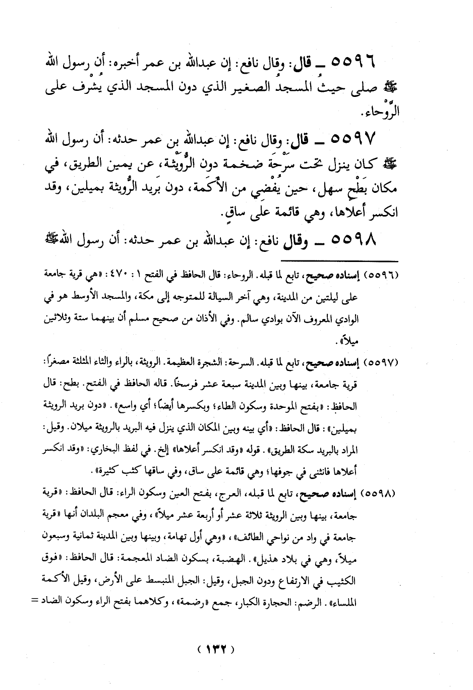 5597 - قال: وقال نافع: إن عبد الله بن عمر حدثه: أن رسول الله - صلى الله عليه وسلم - كان ينزل تحت سَرْحَة ضخمة دون الرُّوَيْثة، عن يمين الطريق، في مكان بَطْح سهل، حين يفْضِي من الأكَمة، دون بريد الرويثة بميلين، وقد انكسر أعلاها، وهي قائمة على ساقي.