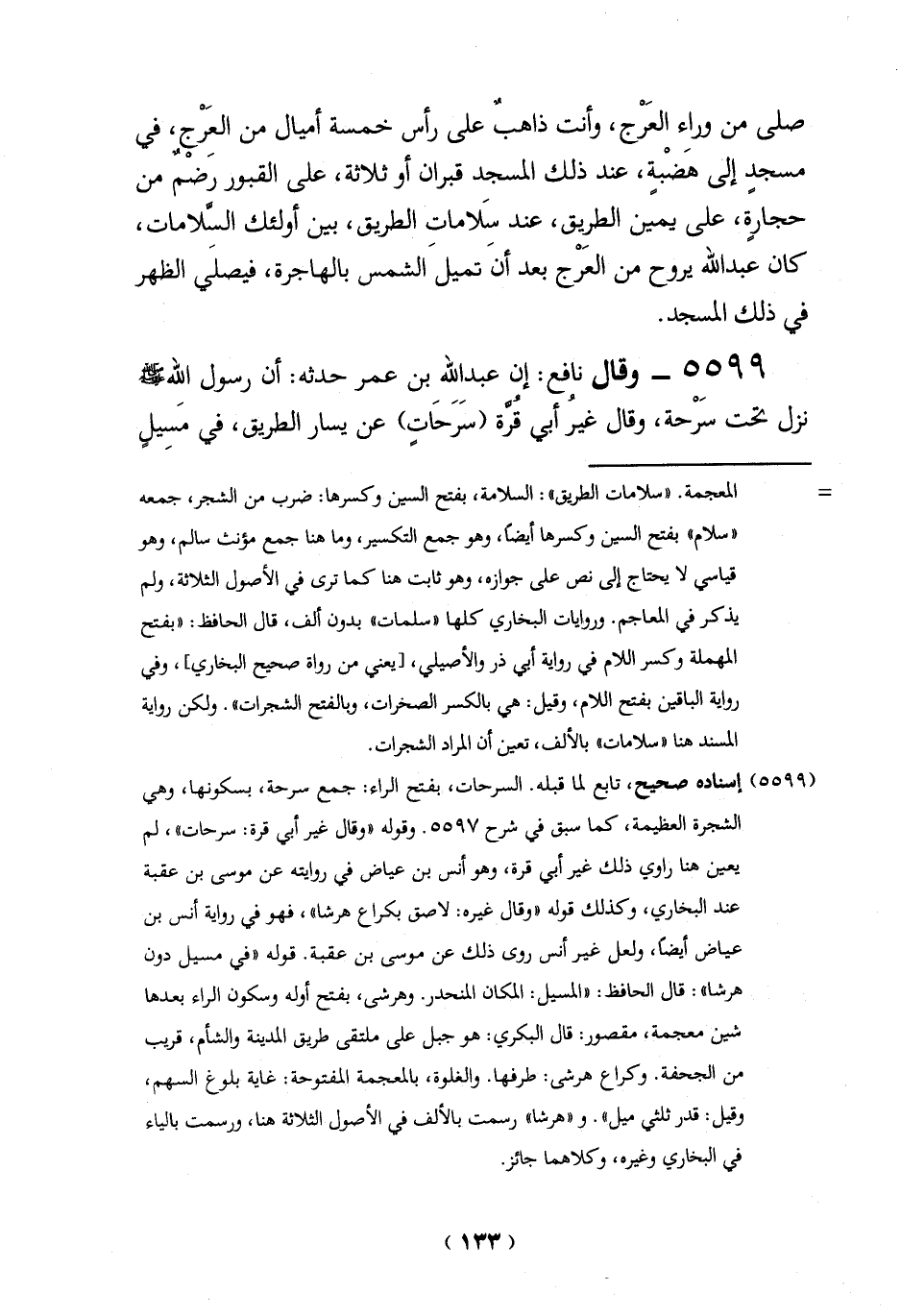 صلى من وراء العَرْج، وأنت ذاهبٌ على رأس خمسة أميال من العَرْج، في مسجدٍ إلى هَضْبةٍ، عند ذلك المسجد قبران أو ثلاثة، على القبور رَضْمٌ من حجارةٍ، على يمين الطريق، عند سَلامات الطريق، بين أولئك السلامات، كان عبد الله يروح من العَرْج بعد أنَ تميلَ الشمس بالهاجرة، فيصلَي الظهر