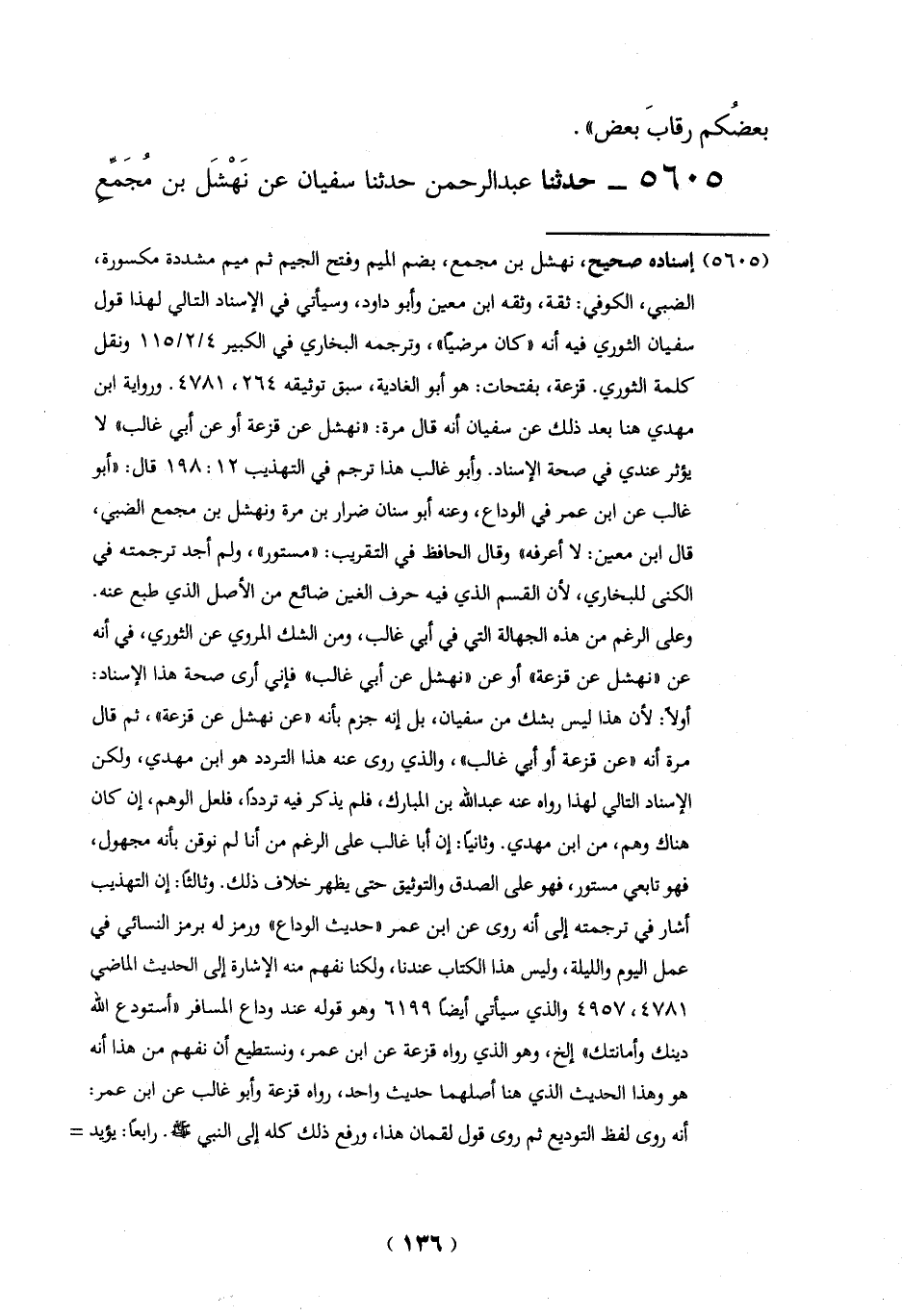 (5605) إسناده صحيح، نهشل بن مجمع، بضم الميم وفتح الجيم ثم ميم مشددة مكسورة، الضبي، الكوفي: ثقة، وثقه ابن معين وأبو داود، وسيأتي في الإسناد التالي لهذا قول سفيان الثوري فيه أنه "كان مرضياً"، وترجمه البخاري في الكبير 4/ 2/ 115 ونقل كلمة الثوري. قزعة، بفتحات: هو أبو الغادية، سبق توثيقه 264، 4781. ورواية ابن مهدي هنا بعد ذلك عن سفيان أنه قال مرة: "نهشل عن قزعة أو عن أبي غالب" لا يؤثر عندي في صحة الإسناد. وأبو غالب هذا ترجم في التهذيب 12: 198 قال: "أبو غالب عن ابن عمر في الوداع، وعنه أبو سنان ضرار بن مرة ونهشل بن مجمع الضبي،