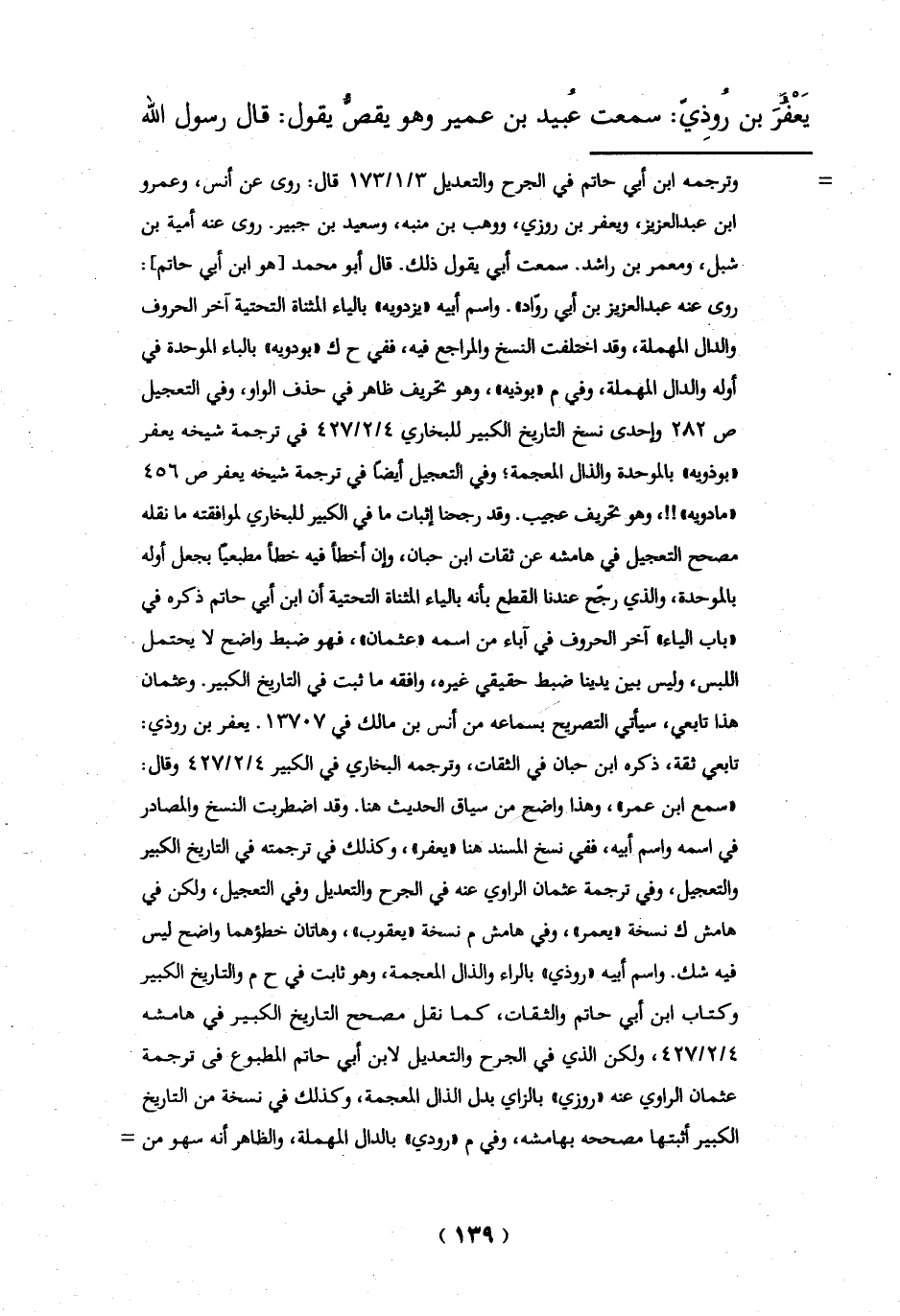 =وترجمه ابن أبي حاتم في الجرح والتعديل 3/ 1/173 قال: روى عن أنس، وعمرو ابن عبد العزيز، ويعفر بن روزي، ووهب بن منبه، وسعيد بن جُبير. روى عنه أمية بن شبل، ومعمر بن راشد. سمعت أبي يقول ذلك. قال أبو محمد [هو ابن أبي حاتم]: روى عنه عبد العزيز بن أبي روّاد". واسم أبيه "يزدويه"، بالياء المثناة التحتية آخر الحروف والدال المهملة، وقد اختلفت النسخ والمراجع فيه، ففي ح ك "بودويه" بالباء الموحدة في أوله والدال المهملة، وفي م "بوذيه"، وهو تحريف ظاهر في حذف الواو، وفي التعجيل ص 282 وإحدى نسخ التاريخ الكبير للبخاري 4/ 2/ 437 في ترجمة شيخه يعفر "بوذويه"، بالموحدة والذال المعجمة؛ وفي التعجيل أيضاً في ترجمة شيخه يعفر ص 456 "مادويه"!!، وهو تحريف عجيب. وقد رجحنا إثبات ما في الكبير للبخاري لموافقته ما نقله مصحح التعجيل في هامشه عن ثقات ابن حبان، وإن أخطأ فية خطأ مطبعياً بجعل أوله بالموحدة، والذي رجح عندنا القطع بأنه بالياء المثناة التحتية أن ابن أبي حاتم ذكره في "باب الياء"، آخر الحروف في آباء من اسمه "عثمان"، فهو ضبط واضح لا يحتمل اللبس، وليس بين يدينا ضبط حقيقي غيره، وافقه ما ثبت في التاريخ الكبير. وعثمان هذا تابعي، سيأتي التصريح بسماعه من أنس بن مالك في 13707. يعفر بن روذي: تابعي ثقة، ذكره ابن حبان في الثقات، وترجمه البخاري في الكبير 4/ 2/ 427 وقال: