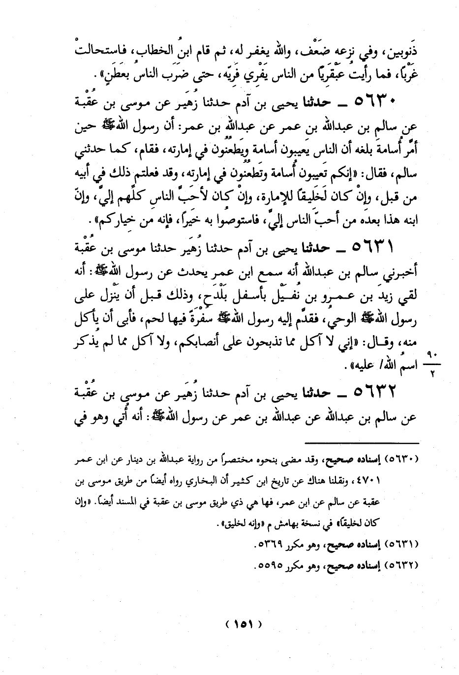 5630 - حدثنا يحيى بن آدم حدثنا زُهَير عن موسى بن عُقْبة عن سالمِ بن عبد الله بنِ عمر عن عبد الله بن عمر: أن رسول الله -صلي الله عليه وسلم - حين أمَّر أُسامة بلغه أن الناسِ يعيبون أسامة ويَطعُنُون في إمارته، فقام، كما حدثني سالم، فقال: "إنكم تعيبون أُسامة وتَطعُنُون في إمارته، وقد فعلتم- ذلك في أبيه من قبل، وإنْ كان لَخَليقاً للإمارة، وإنْ كان لأحبَّ الناسِ كلِّهم إلي، وإنّ ابنه هذا بعدَه من أحبّ الناس إليَّ، فاستوصُوا به خيراً، فإنه من خِياركم".