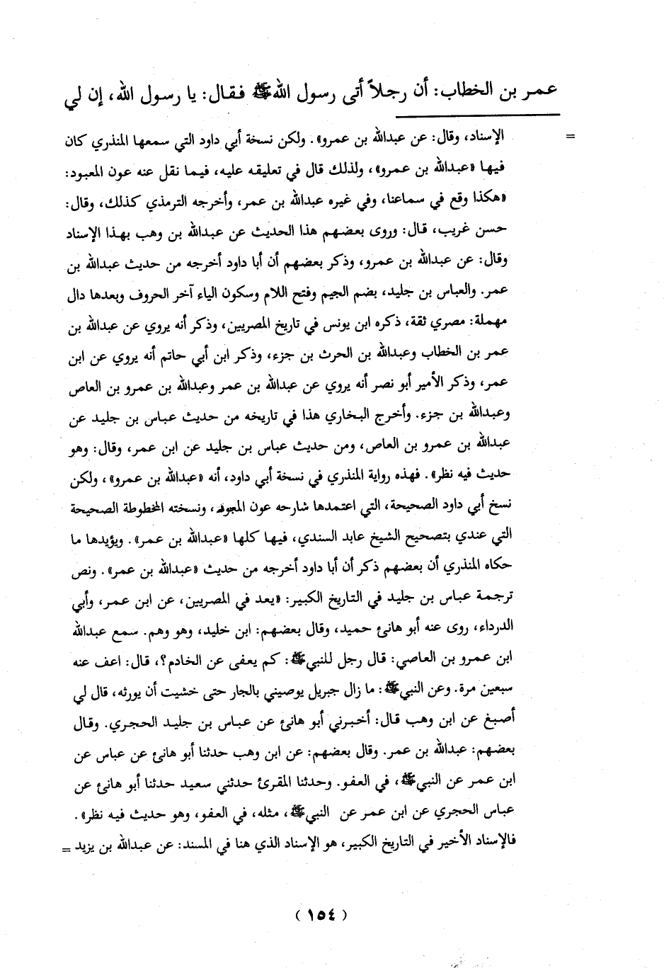 = الإسناد، وقال: عن عبد الله بن عمرو". ولكن نسخة أبي داود التي سمعها المنذري كان فيها "عبد الله بن عمرو"، ولذلك قال في تعليقه عليه، فيما نقل عنه عون المعبود: "هكذا وقع في سماعنا، وفي غيره عبد الله بن عمر، وأخرجه الترمذي كذلك، وقال: حسن غريب، قال: وروى بعضهم هذا الحديث عن عبد الله بن وهب بهذا الإسناد وقال: عن عبد الله بن عمرو، وذكر بعضهم أن أبا داود أخرجه من حديث عبد الله بن عمر. والعباس بن جليد، بضم الجيم وفتح اللام وسكون الياء آخر الحروف ولعدها دال مهملة: مصري ثقة، ذكره ابن يونس في تاريخ المصريين، وذكر أنه يروي عن عبد الله بن عمر بن الخطاب وعبد الله بن الحرث بن جزء، وذكر ابن أبي حاتم أنه يروي عن ابن عمر، وذكر الأمير أبو نصر أنه يروي عن عبد الله بن عمر وعبد الله بن عمرو بن العاص وعبد الله بن جزء. وأخرج البخاري هذا في تاريخه من حديث عباس بن جليد عن عبد الله بن عمرو بن العاص، ومن حديث عباس بن جليد عن ابن عمر، وقال: وهو حديث فيه نظر". فهذه رواية المنذري في نسخة أبي داود، أنه "عبد الله بن عمرو"، ولكن نسخ أبي داود الصحيحة، التي اعتمدها شارحه عون المعبود، ونسخته المخطوطة الصحيحة التي عندي بتصحيح الشيخ عابد السندي، فيها كلها "عبد الله بن عمر". ويؤيدها ما حكاه المنذري أن بعضهم ذكر أن أبا داود أخرجه من حديث "عبد الله بن عمر". ونص ترجمة عباس بن جليد في التاريخ الكبير: "يعد في المصريين، عن ابن عمر، وأبي الدرداء، روى عنه أبو هانئ حميد، وقال بعضهم: ابن خليد، وهو وهم. سمع عبد الله ابن عمرو بن العاصي: قال رجل للنبي - صلى الله عليه وسلم -: كم يعفى عن الخادم؟، قال: اعف عنه سبعين مرة. وعن النبي -صلي الله عليه وسلم -: ما زال جبريل يوصيني بالجار حتى خشيت أن يورثه، قال لي أصبغ عن ابن وهب قال: أخبرني أبو هانئ عن عباس بن جليد الحجري. وقال بعضهم: عبد الله بن عمر. وقال بعضهم: عن ابن وهب حدثنا أبو هانئ عن عباس عن ابن عمر عن النبي -صلي الله عليه وسلم -، في العفو. وحدثنا المقرئ حدثني سعيد حدثنا أبو هانئ عن عباس الحجري عن ابن عمر عن النبي -صلي الله عليه وسلم -، مثله، في العفو، وهو حديث فيه نظر".
