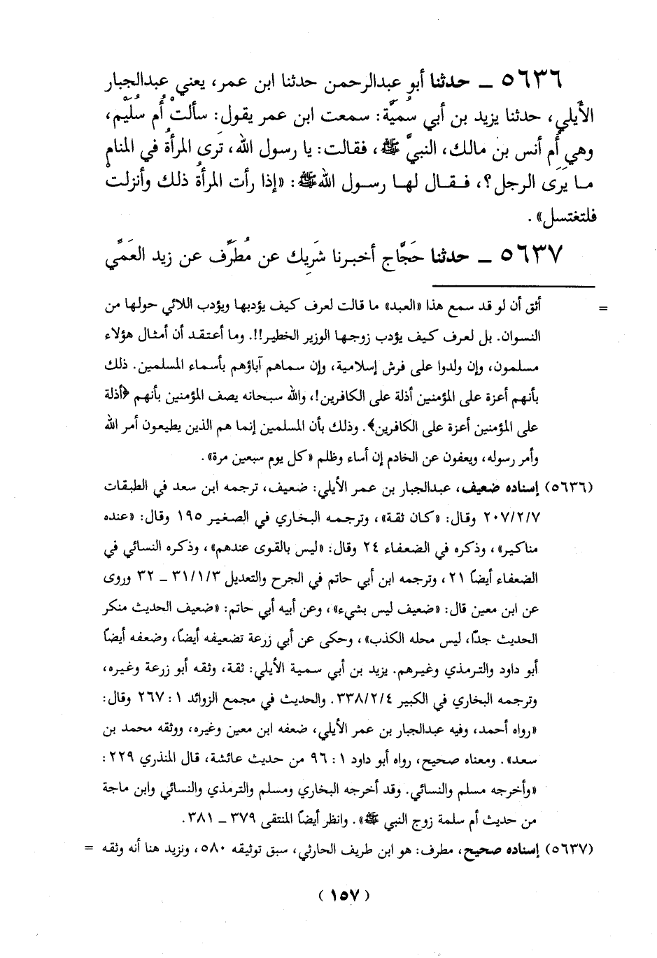 5636 - حدثنا أبو عبد الرحمن حدثنا ابن عمر، يعني عبد الجبار الأيلي، حدثنا يزيد بن أبي سُميَّة: سمعت ابن عمر يقولِ: سألتْ أم سليم، وهىِ أِم أنس بن مالك، النبي -صلي الله عليه وسلم -، فقالت: يا رسول الله، ترى المرأة في المنام ما يرى الرجل؟، فقال لها رسول الله -صلي الله عليه وسلم -: "إذا رأت المرأة ذلك وأنزلت فلتغتسل".