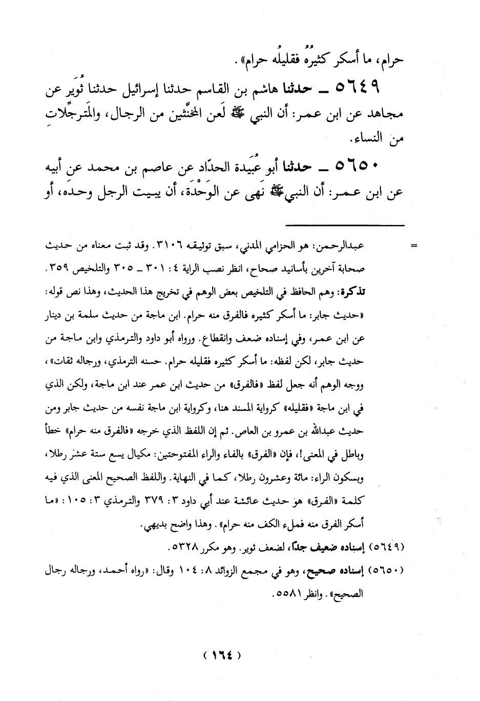 تذكرة: وهم الحافظ في التلخيص بعض الوهم في تخريج هذا الحديث، وهذا نص قوله: "حديث جابر: ما أسكر كثيره فالفرق منه حرام. ابن ماجة من حديث سلمة بن دينار عن ابن عمر، وفي إسناده ضعف وانقطاع. ورواه أبو داود والترمذي وابن ماجة من حديث جابر، لكن لفظه: ما أسكر كثيره فقليله حرام. حسنه الترمذي، ورجاله ثقات"، ووجه الوهم أنه جعل لفظ "فالفرق" من حديث ابن عمر عند ابن ماجة، ولكن الذي في ابن ماجة "فقليله" كرواية المسند هنا، وكرواية ابن ماجة نفسه من حديث جابر ومن حديث عبد الله بن عمرو بن العاص. ثم إن اللفظ الذي خرجه "فالفرق منه حرام" خطأ وباطل في المعنى!، فإن "الفرق" بالفاء والراء المفتوحتين: مكيال يسع ستة عشر رطلا،