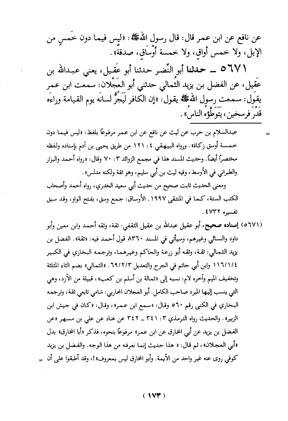 عن نافع عن ابن عمر قال: قال رسول الله -صلي الله عليه وسلم -: "ليس فيما دون خَمسٍ من الإبل، ولا خمس أواقٍ، ولا خمسة أوْسَاقٍ، صدقةٌ".