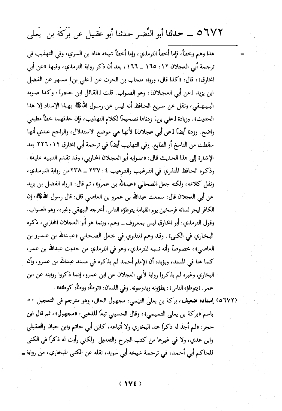 = هذا وهم وخطأ، فإما أخطأ الترمذي، وإما أخطأ شيخه هناد بن السري، وفي التهذيب في ترجمة أبي العجلان 12: 165 - 166، بعد أن ذكر رواية الترمذي، وفيها "عن أبي المخارق"، قال: "كذا قال، ورواه منجاب بن الحرث عن [علي بن]، مسهر عن الفضل ابن يزيد [عن أبي العجلان]، وهو الصواب. قلت [القائل ابن حجر]: وكذا صوبه البيهقي، ونقل عن سريع الحافظ أنه ليس عن رسول الله بهذا الإسناد إلا هذا الحديث". وزيادة [على بن]، زدناها تصحيحاً لكلام التهذيب، فإن حذفهما خطأ مطبعي واضح. وزدنا أيضاً [عن أبي عجلان] لأنها هي موضع الاستدلال، والراجح عندي أنها سقطت من الناسخ أو الطابع. وفي التهذيب أيضاً في ترجمة أبي المخارق 12: 226 بعد الإشارة إلى هذا الحديث قال: "صوابه أبو العجلان المحاربي، وقد تقدم التنبيه عليه".
