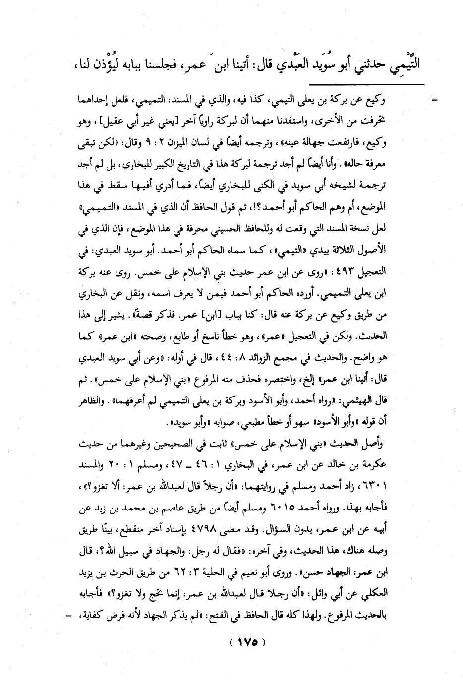 = وكيع عن بركة بن يعلى التيمي، كذا فيه، والذي في المسند: التميمي، فلعل إحداهما تحرفت من الأخرى، واستفدنا منهما أن لبركة راوياً آخر [يعني غير أبي عقيل]، وهو وكيع، فارتفعت جهالة عينه"، وترجمه أيضاً في لسان الميزان 2: 9 وقال: "لكن تبقى معرفة حاله". وأنا أيضاً لم أجد ترجمة لبركة هذا في التاريخ الكبير للبخاري، بل لم أجد ترجمة لشيخه أبي سويد في الكنى للبخاري أيضاً، فما أدري أفيها سقط في هذا الموضع، أم وهم الحاكم أبو أحمد؟!، ثم قول الحافظ أن الذي في المسند "التميمي" لعل نسخة المسند التي وقعت له وللحافظ الحسيني محرفة في هذا الموضع، فإن الذي في الأصول الثلاثة بيدي "التيمي"، كما سماه الحاكم أبو أحمد. أبو سويد العبدي: في التعجيل 493: "روى عن ابن عمر حديث بني الإِسلام على خمس. روى عنه بركة ابن يعلى التميمي. أورده الحاكم أبو أحمد فيمن لا يعرف اسمه، ونقل عن البخاري من طريق وكيع عن بركة عنه قال: كنا بباب [ابن] عمر. فذكر قصةَ". يشير إلى هذا الحديث. ولكن في التعجيل "عمر"، وهو خطأ ناسخ أو طابع، وصحته "ابن عمر" كما هو واضح. والحديث في مجمع الزوائد 8: 44، قال في أوله: "وعن أبي سويد العبدي قال: أتينا ابن عمر" إلخ، واختصره فحذف منه المرفوع " بني الإِسلام على خمس". ثم قال الهيثمي: "رواه أحمد، وأبو الأسود وبركة بن يعلى التميمي لم أعرفهما". والظاهر أن قوله "وأبو الأسود" سهو أو خطأ مطبعي، صوابه "وأبو سويد".