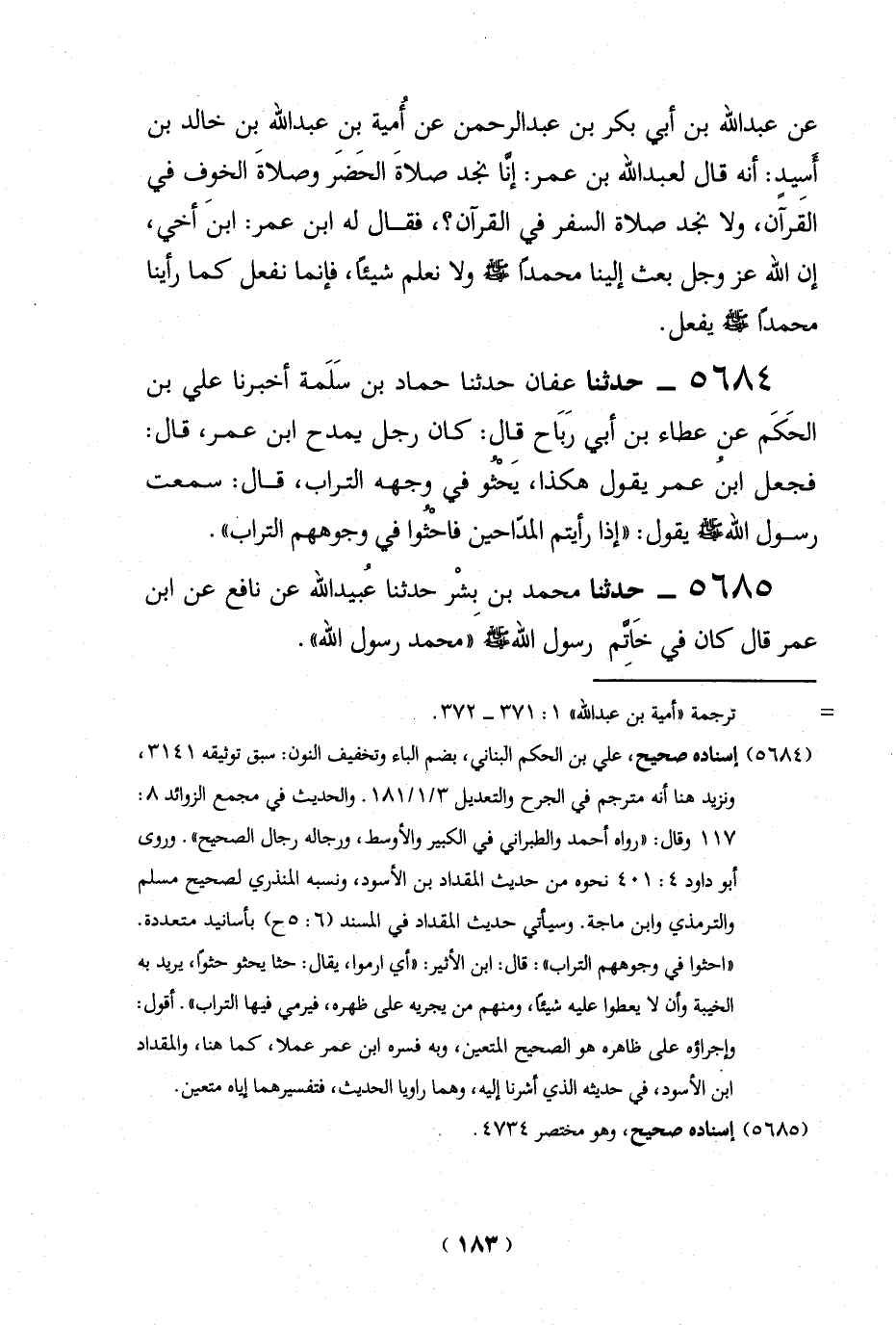 5684 - حدثنا عفان حدثنا حماد بن سَلَمة أخبرنا علي بن الحَكَم عن عطاء بن أبي رَبَاح قال: كان رجل يمدح ابن عمر، قال: فجعل ابنُ عمر يقول هكذا، يَحْثُوا في وجهه التراب, قال: سمعت رسول الله -صلي الله عليه وسلم - يقول: "إذا رأيتم المدّاحين فاحثوا في وجوههم التراب".