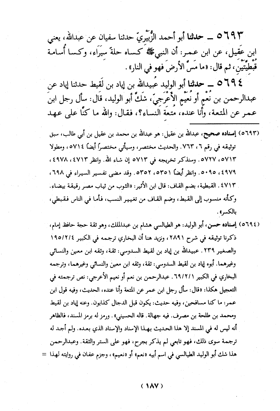 (5694) إسناده حسن، أبو الوليد: هو الطيالسي هشام بن عبد الملك، وهو ثقة حجة حافظ إمام، ذكرنا توثيقه في شرح 2891، ونزيد هنا أن البخاري ترجمه في الكبير 4/ 2/ 195 والصغير 239. عُبيد الله بن إياد بن لقيط السدوسي: ثقة، وثقه ابن معين والنسائي وغيرهما. أبوه إياد بن لقيط السدوسي: ثقة، وثقه ابن معين والنسائي وغيرهما، وترجمه البخاري في الكبير 1/ 2/ 69. عبد الرحمن بن نعم أو نعيم الأعرجي: نص ترجمته في التعجيل هكذا: "قال: سأل رجل ابن عمر عن المتعة وأنا عنده، الحديث، وفيه قول ابن عمر: ما كنا مسافحين، وفيه حديث: يكون قبل الدجال كذابون. وعنه إياد بن لقيط ومحمد بن طلحة بن مصرف. فيه جهالة. قاله الحسيني". ورمز له برمز المسند، فالظاهر أنه ليس له في المسند إلا هذا الحديث بهذا الإسناد والإسناد الذي بعده. ولم أجد له